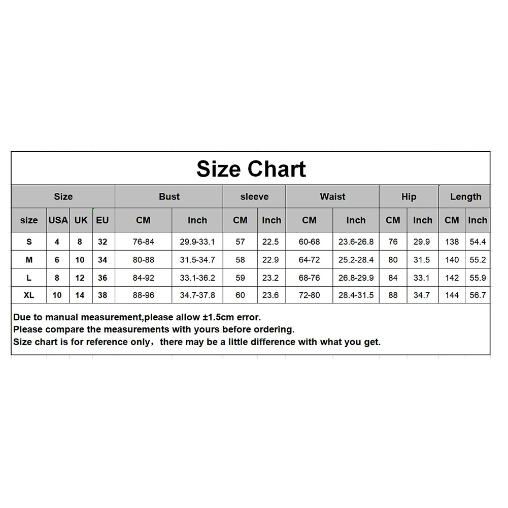 [Наш Размер L] Обхват груди: 84 см-92 см/33,07 "-36,22", рукав: 59 см/23,23 ", обхват талии: 68 см-76 см/26,77 дюйма-29,92 дюйма, обхват бедер: 84 см/33,07 дюйма, длина: 142 см/55,9 дюйма (прибл.)