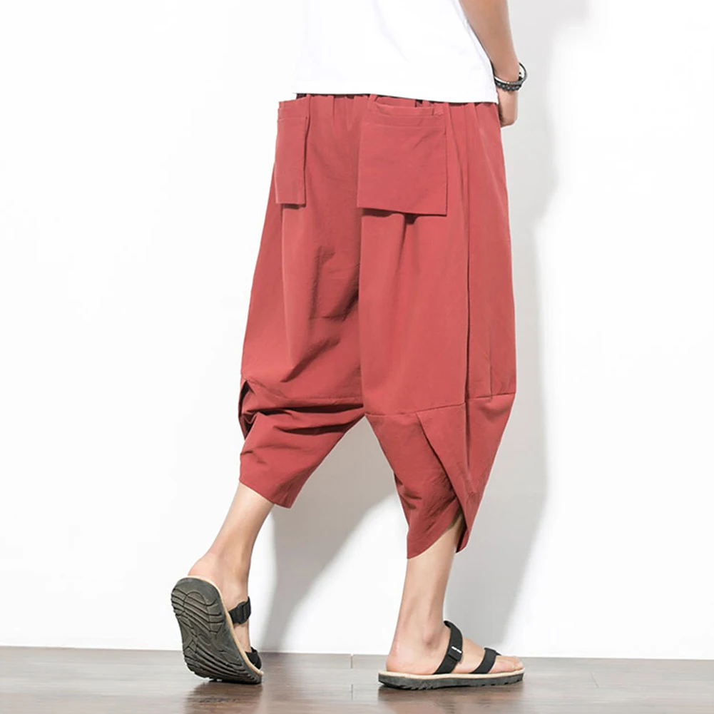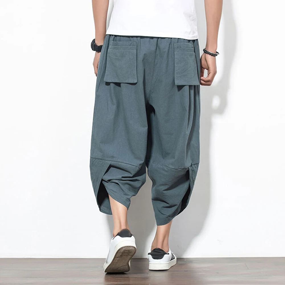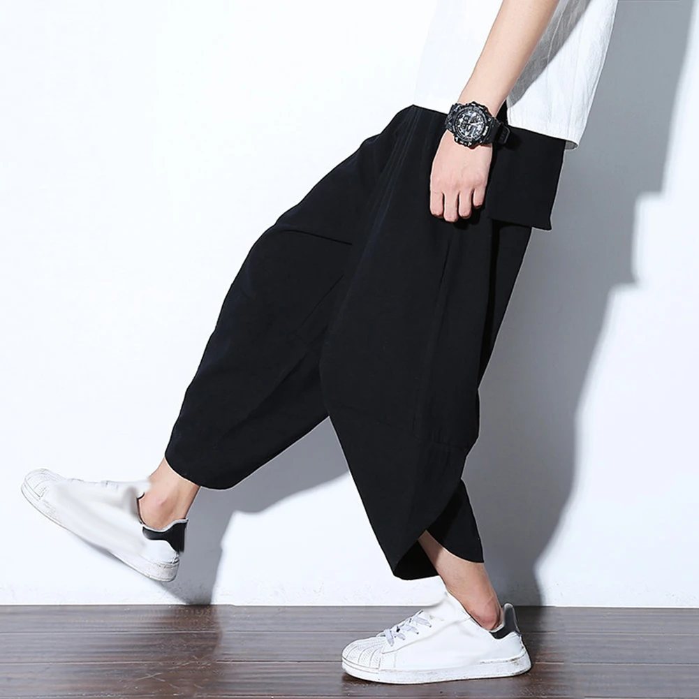 Мужские летние повседневные однотонные укороченные штаны-шаровары размера плюс, широкие брюки
