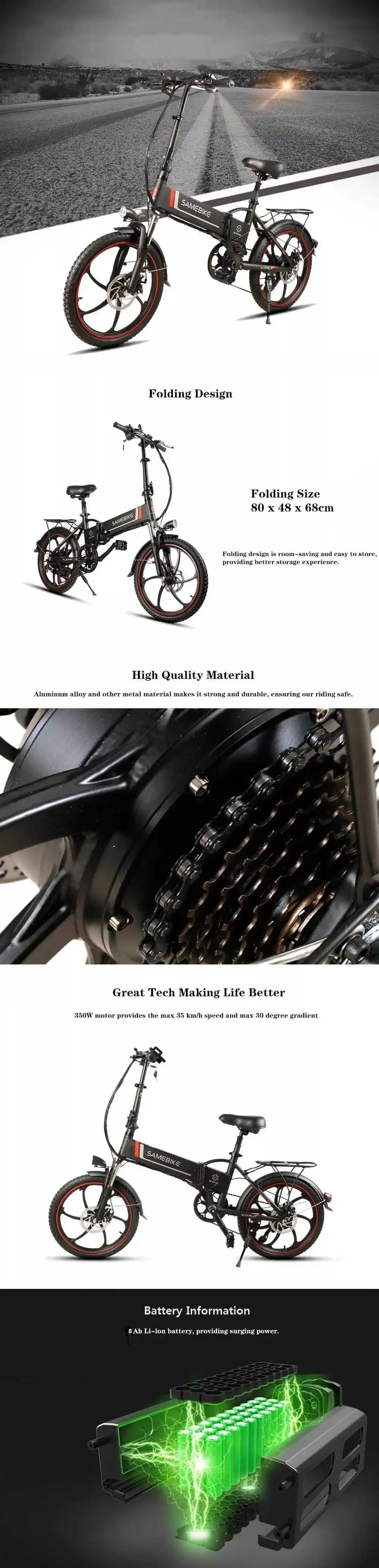 Бренд SAMEBIKE 20LVXD30 Размер Материал Алюминий из алюминиевого сплава Размер в сложенном виде 80*48*68 см Посылка Размер 92*38*70 см Размер колес 20 дюймов Стандарты Батарея клетки Литий 18650 Батарея Емкость 10AH Ручка поворота Сцепление половина Электрический режим запуска Pedelec Коробка передач 7 скоростей Батарея Номинальная мощность 480W Номинальная мощность двигателя 350W Время зарядки 4 часа Вход напряжения 110-240V Обод Алюминий сплав спицевое колесо Производительность Вес брутто 30 кг Максимальная нагрузка 120 кг Максимальная скорость 35 км/ч Макс подъем 30 °Особенности : ● Колесный двигатель мощностью 350 Вт (макс. 600 Вт) обеспечивает максимальную скорость 35 км/ч и максимальный градиент 30 градусов. ● Литий-ионный аккумулятор 10 Ач (входит в комплект). ● 20 дюймовые резиновые надувные колеса для различных условий. ● Быстрая Складная конструкция для удобной переноски в багажнике автомобиля. ● Корпус из алюминиевого сплава для максимальной грузоподъемности 120 кг. ● Подходит для взрослых и подростков для развлечения.