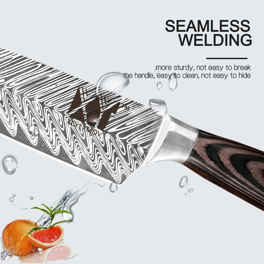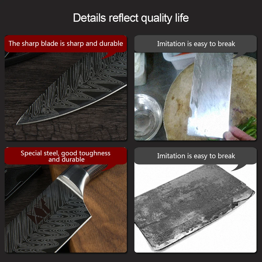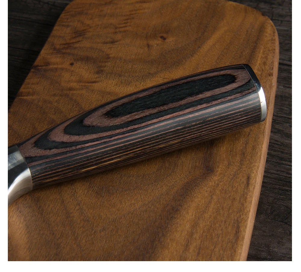 1*8 дюймовый нож шеф-повара 1*8 дюймов нож для нарезки 1*7 дюймов нож Santoku Ножи 1*5 дюймов нож Santoku Ножи 1*5 дюймов Универсальный Ножи 1*3,5 дюймовый фруктовый нож 6 * крышка ножа Материал ручки: цветная древесина Материал лезвия: нержавеющая сталь Форма ручки: изгиб ручки 1. Этот нож высшего класса был полностью изготовлен из искусственной кожи на нашей фабрике. Он функциональный и хорошо сбалансированный, хорошо подходит для практики и коллекций! 2. Лезвие этого ножа высшего класса прочное и острое благодаря большему количеству процедур. Он высококлассный и прочный. 3. Это универсальный нож, который вы должны иметь. Это тот, который вы хотите, чтобы он был расширением вашей руки. Если вы хотите нож, то это один для всего. Конечный Режущий инструмент для повседневного измельчения и измельчения фруктов, овощей, мяса и рыбы. Он известен как лучший друг шеф-повара. 4. Обратите внимание: из-за различных методов измерения размер и вес продукта могут иметь небольшую погрешность; Пожалуйста, не помещайте в посудомоечную машину.