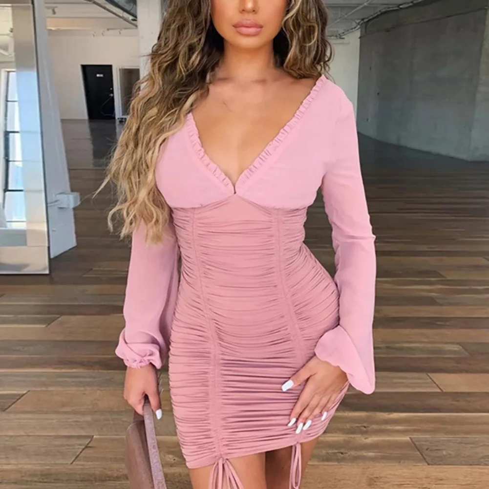 Сексуальное женское платье с длинным рукавом, глубоким v-образным вырезом и открытой спиной, плиссированное сексуальное мини-платье для ночного клуба, vestidos de festa roupa feminina