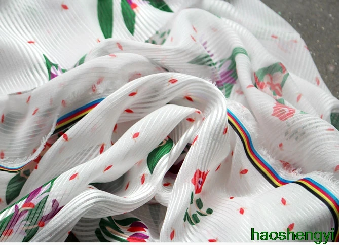 Printed white stripe red green pink flowers and grass chiffon decorative fabric translucent beach wind shirt fabric
