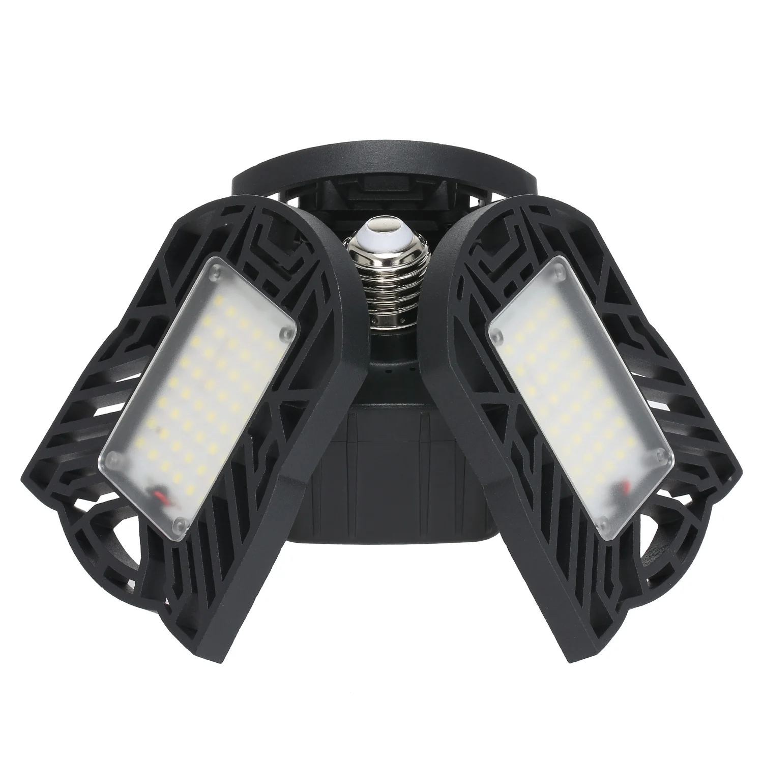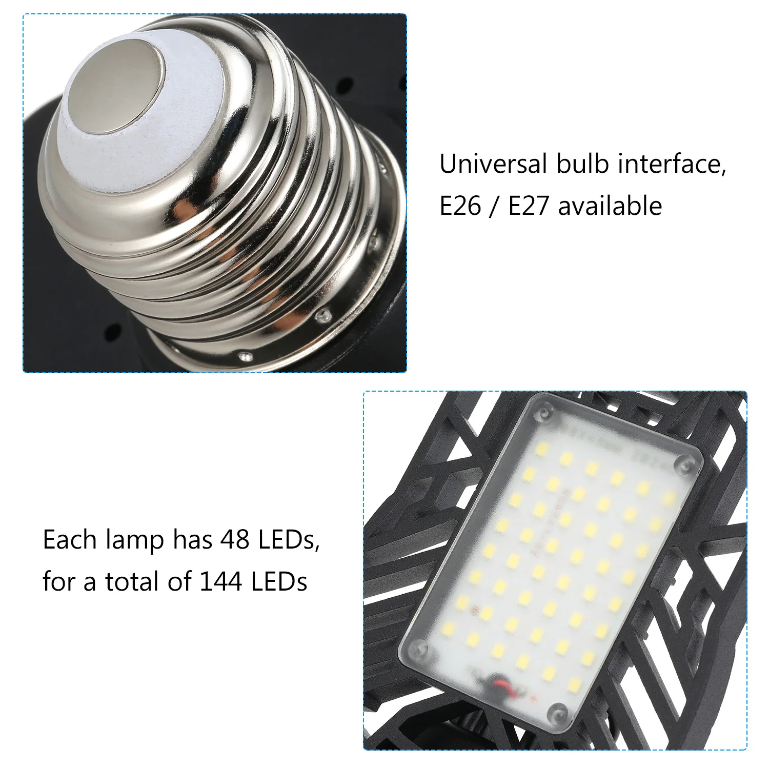 This foldable LED light can be used for parking lighting, and the bulb head is available in E26 / E27 for indoor lighting only. The lamp leaf can be folded 90 degrees, 144 LED small bulbs, color temperature 6000-6500K, providing sufficient illumination.