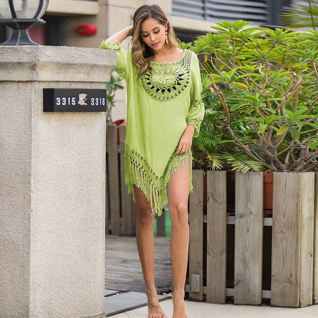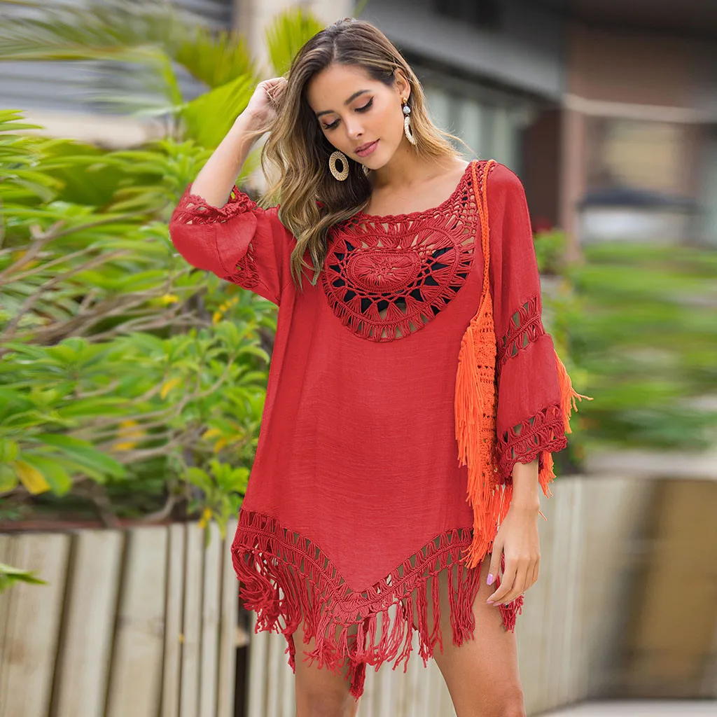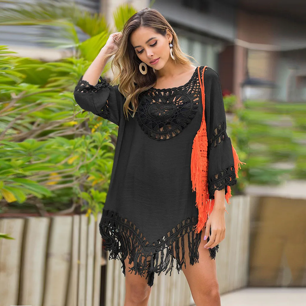 3.КруглыйШея, 3/4Рукав,МиниДлина,С вырезами, кисточками,Очаровательный и привлекательный. Простой, но модный. Свободный крой. Предотвращение Кожа Повреждения, когда вы играете на пляже.