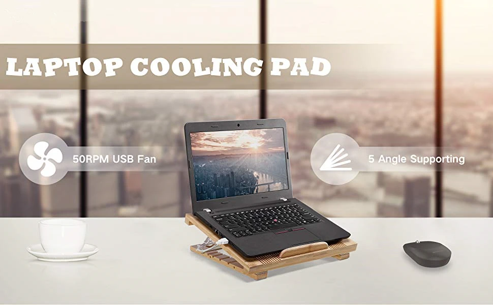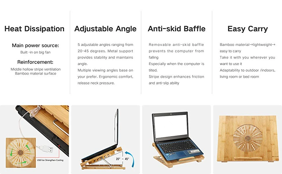 Холодный материал: Охлаждающая способность бамбукового материала плюс отведение тепла вентилятором USB всегда остывает ваш ноутбук. Функциональный вентилятор охлаждения ноутбука: вентилируемый дизайн помогает сохранить ваше электронное устройство прохладным. Полосатая конструкция с отверстиями противоскользящая, а также способ heat-dissapating.Removable выступа может остановить скольжение компьютера при наклоне. Эргономичная Удобная настольная подставка: регулируемые складные ножки для идеальной высоты и угла обзора. Горизонтальный прицел может уменьшить усталость глаз. 5 различных высоты для регулировки. Подставка для ноутбука с вентилятором: регулируемая бамбуковая подушечка с usb-вентилятором совместима с ноутбуками, планшетами и ноутбуками. Размер ноутбука до 15,6 дюймов. Портативный охлаждающая пластина. Легкий и легко носить с собой. Бамбуковый материал более экологичный.