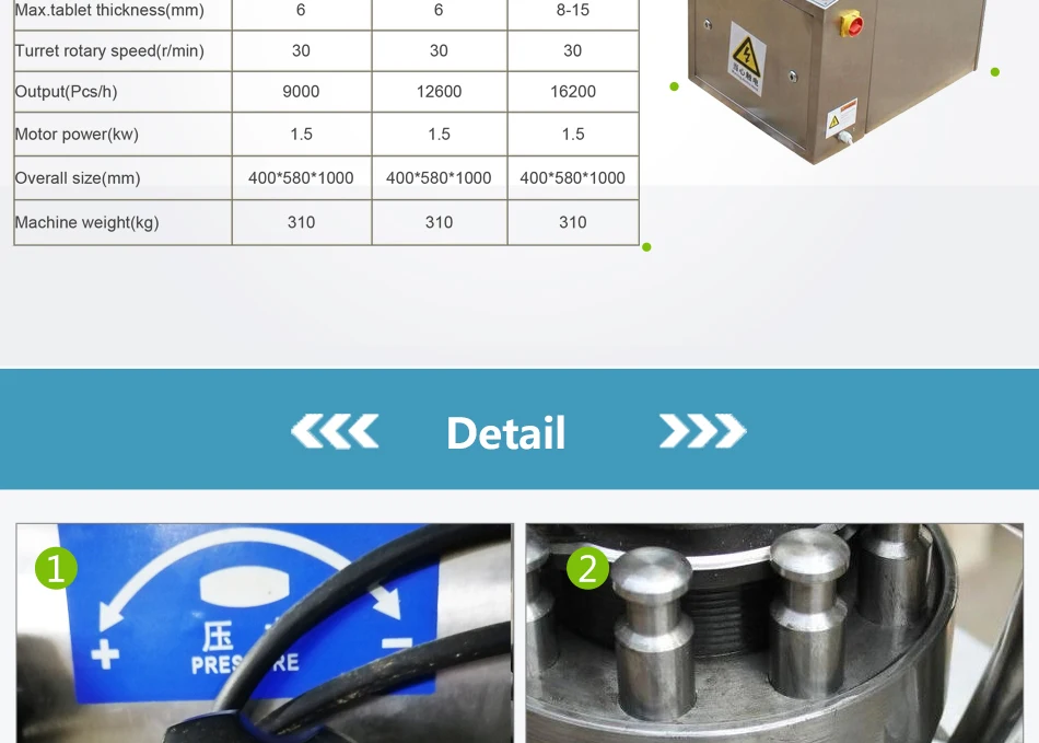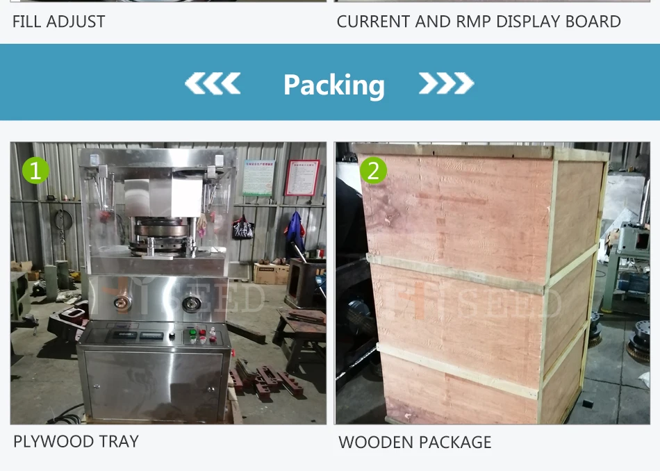 ZP5A 7A 9A series of tablet pressing machine is a new type of rotary tablet press designed by our company, which can be used to make granular raw materials into various shapes. In addition to the suppression of the circular plate, but also the suppression of special-shaped pieces, special films, double film, ring, etc., can be customized according to your requirements. At the same time, the operation, the noise is small, pressure, excessive pressure to stop the machine to avoid damage. Model ZP-5A Punch quantity(Sets) 5 Max.tablet pressure(kn) 40 Max.tablet diameter(mm) 12 Max.filling depth(mm) 15 Max.tablet thickness(mm) 6 Turret rotary speed(r/min) 30 Output(Pcs/h) 9000 Motor power(kw) 1.5 Overall size(mm) 400*580*1000 Machine weight(kg) 310 Model ZP-7A Punch quantity(Sets) 7 Max.tablet pressure(kn) 60 Max.tablet diameter(mm) 12 Max.filling depth(mm) 15 Max.tablet thickness(mm) 6 Turret rotary speed(r/min) 30 Output(Pcs/h) 12600 Motor power(kw) 1.5 Overall size(mm) 400*580*1000 Machine weight(kg) 310 Model ZP-9A Punch quantity(Sets) 9 Max.tablet pressure(kn) 60 Max.tablet diameter(mm) 12 Max.filling depth(mm) 6 Max.tablet thickness(mm) 8-15 Turret rotary speed(r/min) 30 Output(Pcs/h) 16200 Motor power(kw) 1.5 Overall size(mm) 400*580*1000 Machine weight(kg) 310