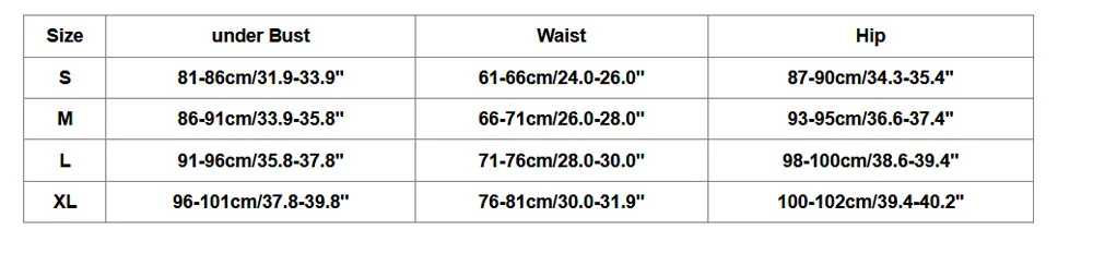 Размеры Обхват под грудью Обхват талии Обхват бедер S 81-86 см/31,9-33,9" 61-66 см/24,0-26,0'' 87-90 см/34,3-35,4'' М 86-91 см/33,9-35,8" 66-71 см/26,0-28,0'' 93-95 см/36,6-37,4'' L 91-96 см/35,8-37,8'' 71-76 см/28,0-30,0'' 98-100 см/38,6-39,4'' XL 96-101 см/37,8-39,8'' 76-81 см/30,0-31,9'' 100-102 см/39,4-40,2''