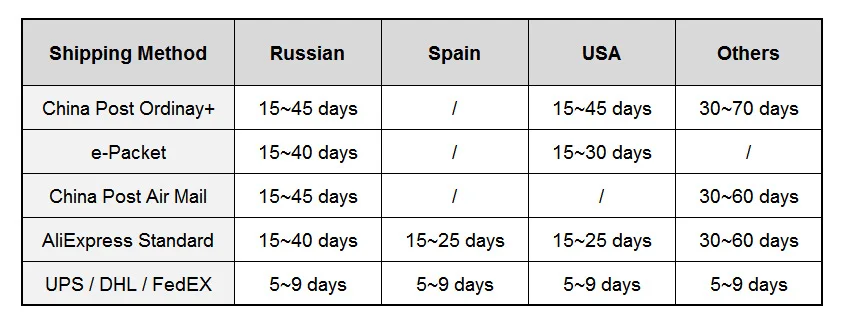Для 80% стран, когда ваш заказ превышает 120 долларов США, мы отправляем его черезСлужбы экспресс-доставкиТакие как DHL