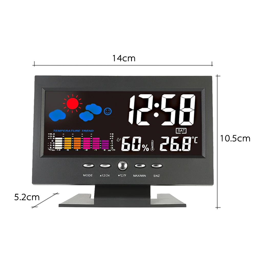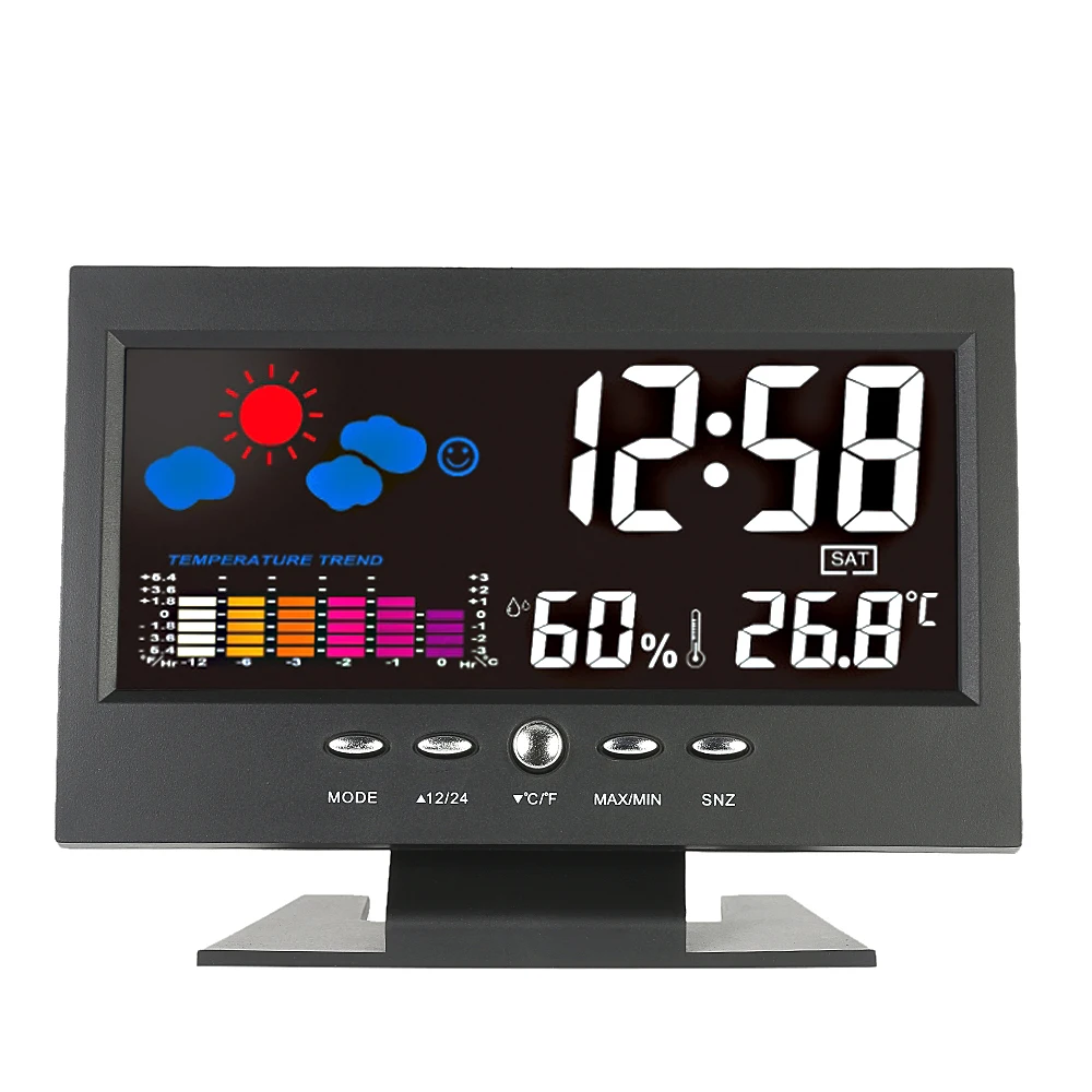 -Отображение времени, даты, недели и измерения температуры и влажности. -Отображение максимальной и минимальной температуры и влажности. -Прогноз погоды: солнечный, частично солнечный, облачный, дождливый и дождливый. -°C / °F блок температуры опционально. -Отображение времени 12/24 часов по желанию. -Цветной ЖК-дисплей с подсветкой. -Функция управления звуком: при оповещении или звуке светодиод загорится. -Функция Sense light: подсветка автоматически загорается в темноте через «ON S/C OFF». -Он также имеет функции будильника и повтора.