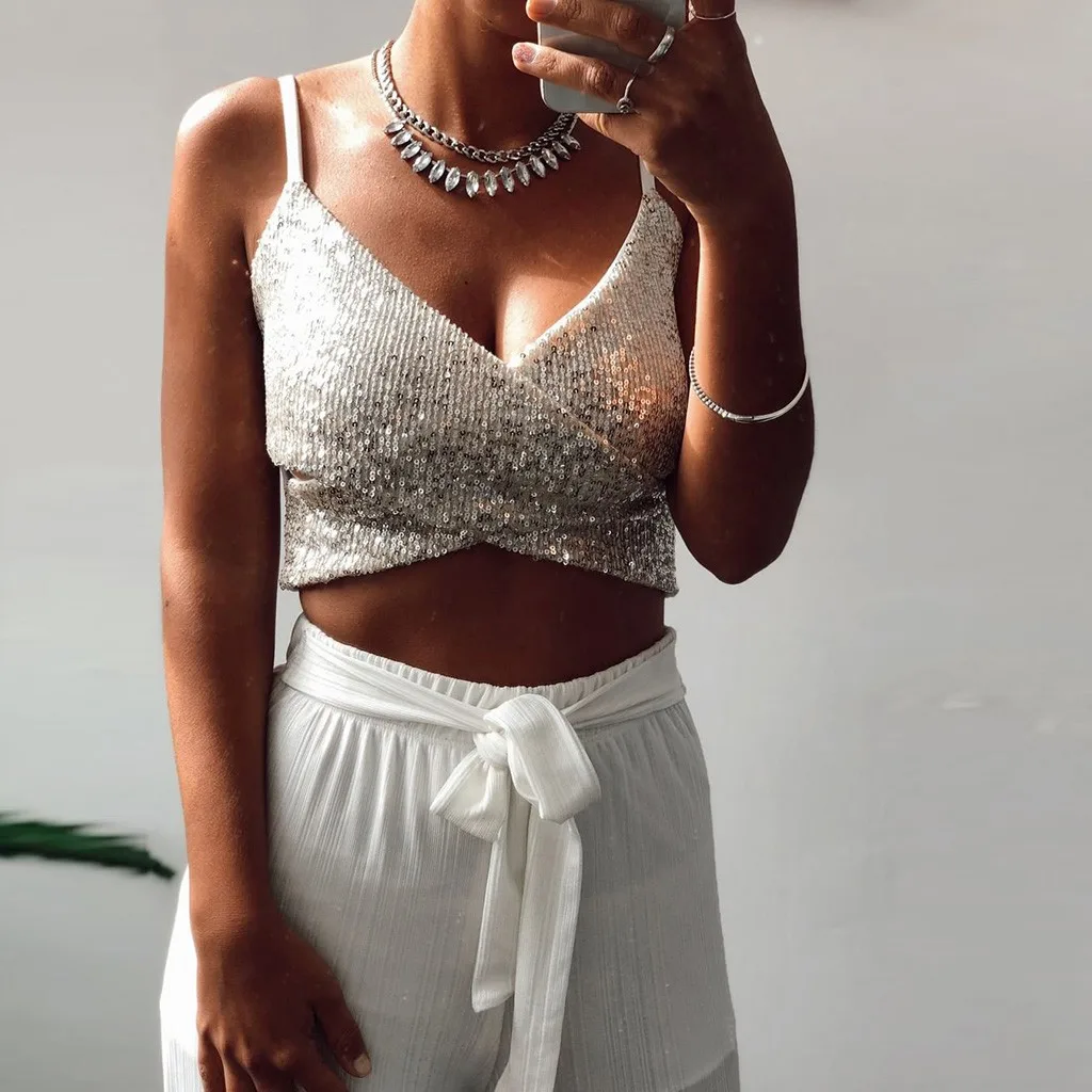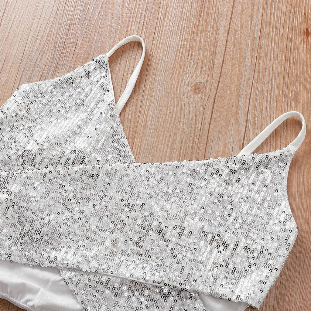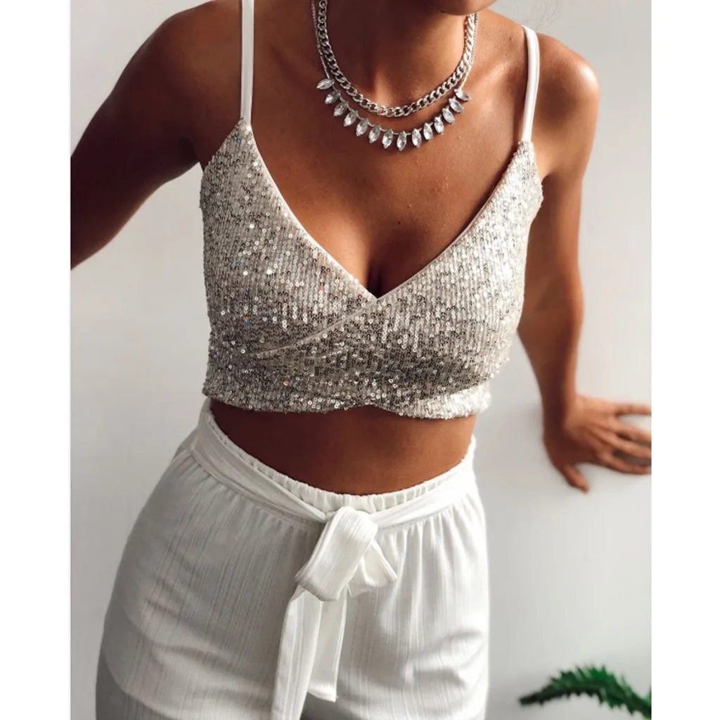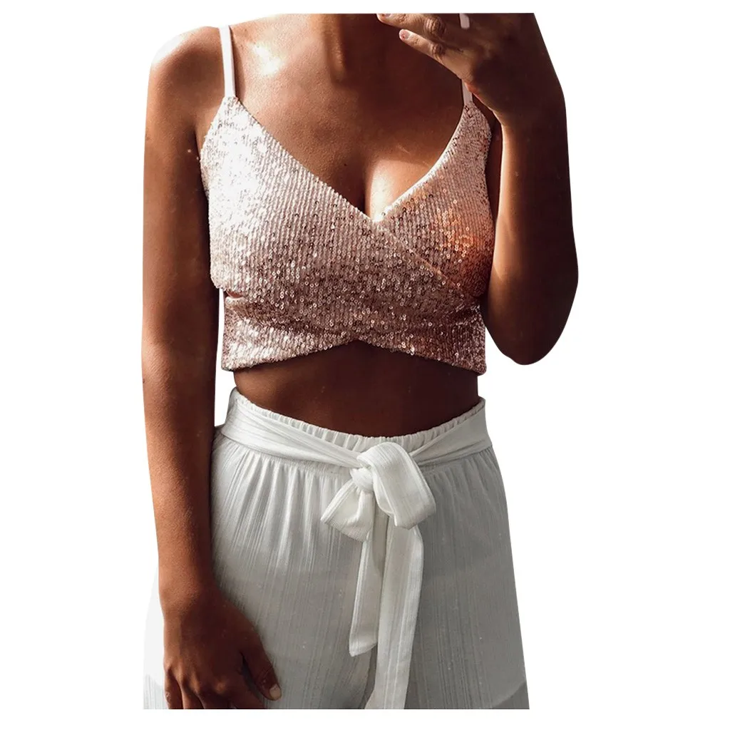 Для женщин сексуальное платье без рукавов Тонкий Повседневный Топ на бретелях с блестками; Короткий жилет