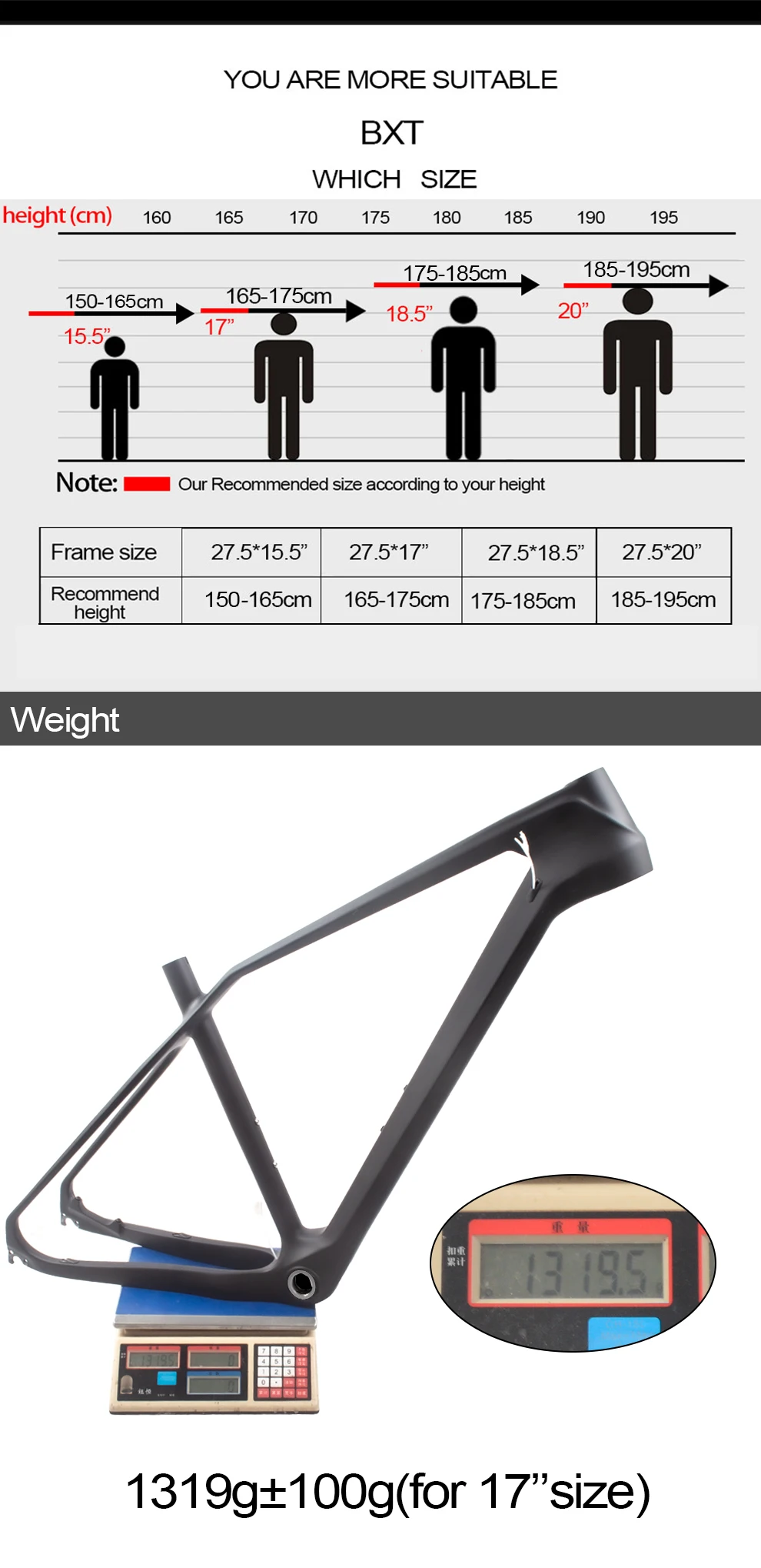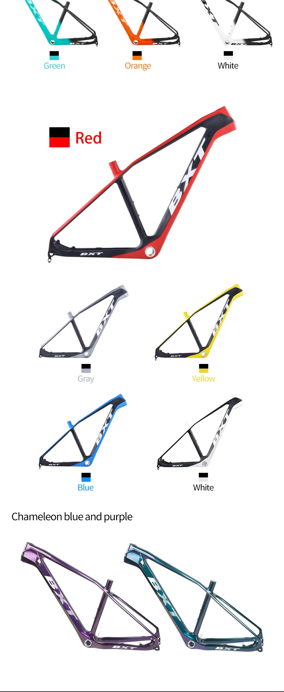 Название бренда: BXT Модель: BXT-MTB-036 Название продукта: рама для горного велосипеда из углеродного волокна 27,5 ER Отделка: глянцевая/матовая Доступные размеры: 15,5 дюйма, 17 дюймов, 18,5 дюйма, 20 дюймов BB:BSA Изделие содержит: каркас + зажим сиденья + алюминиевые детали Тормозная система: дисковый тормоз Если вам нужны пользовательские цвета или нет логотипа, пожалуйста, свяжитесь с нами. Если вы хотите купить заднюю ось 142*12 мм или гарнитуру, пожалуйста, обратитесь в службу поддержки клиентов