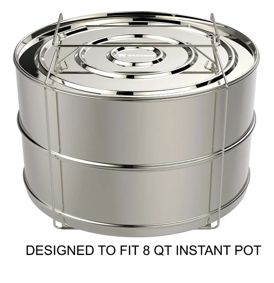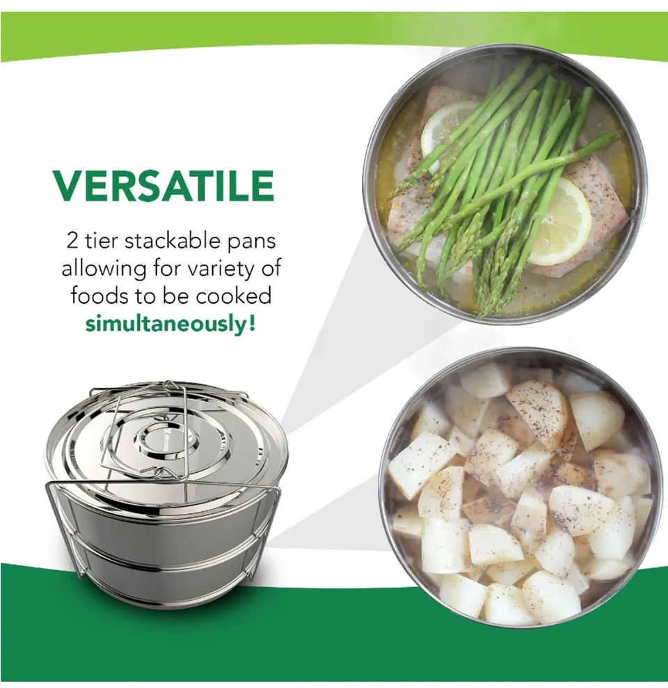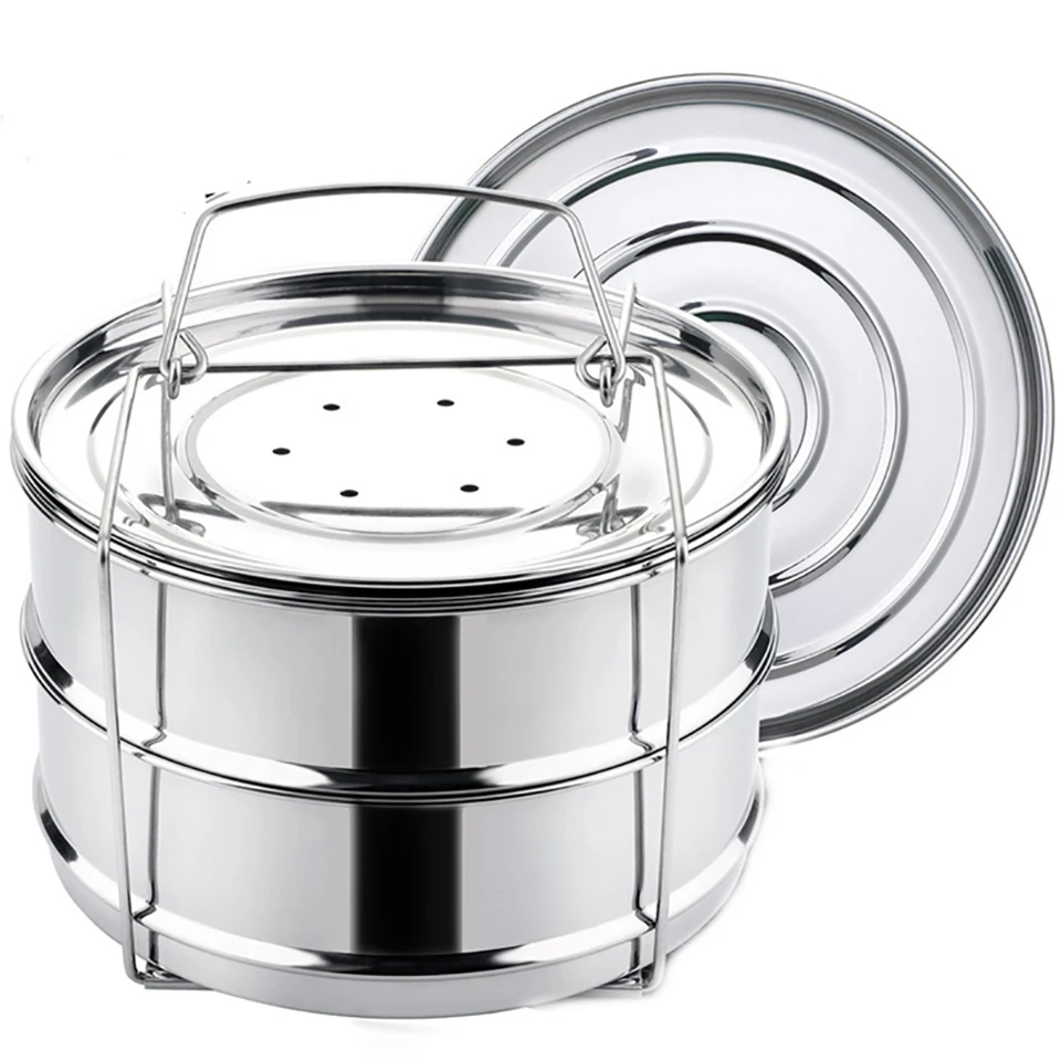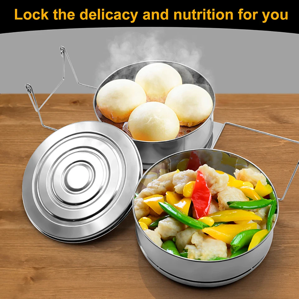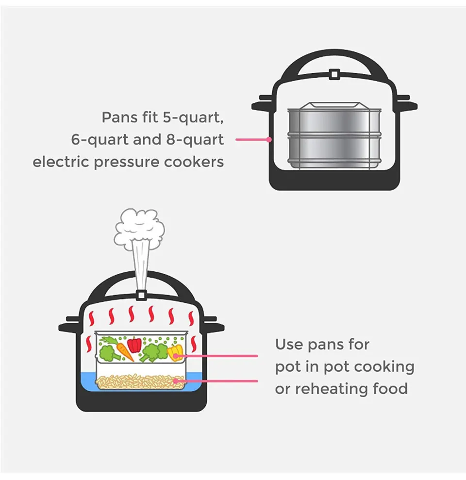 Универсальный-два уровня штабелируемые контейнеры для приготовления различных продуктов в отдельных контейнерах в то же время, отлично подходит для приготовления пищи в кастрюле, сохранения питательных веществ и витамины, таких как приготовление на пару риса, овощи, кукурузный хлеб, фарш, мясо или рыба. Его можно использовать в качестве десертной сковороды, чтобы сделать чизкейки или сделать лазанью. Также отлично подходит для быстрого повторного нагрева остатков без микроволновой печи.