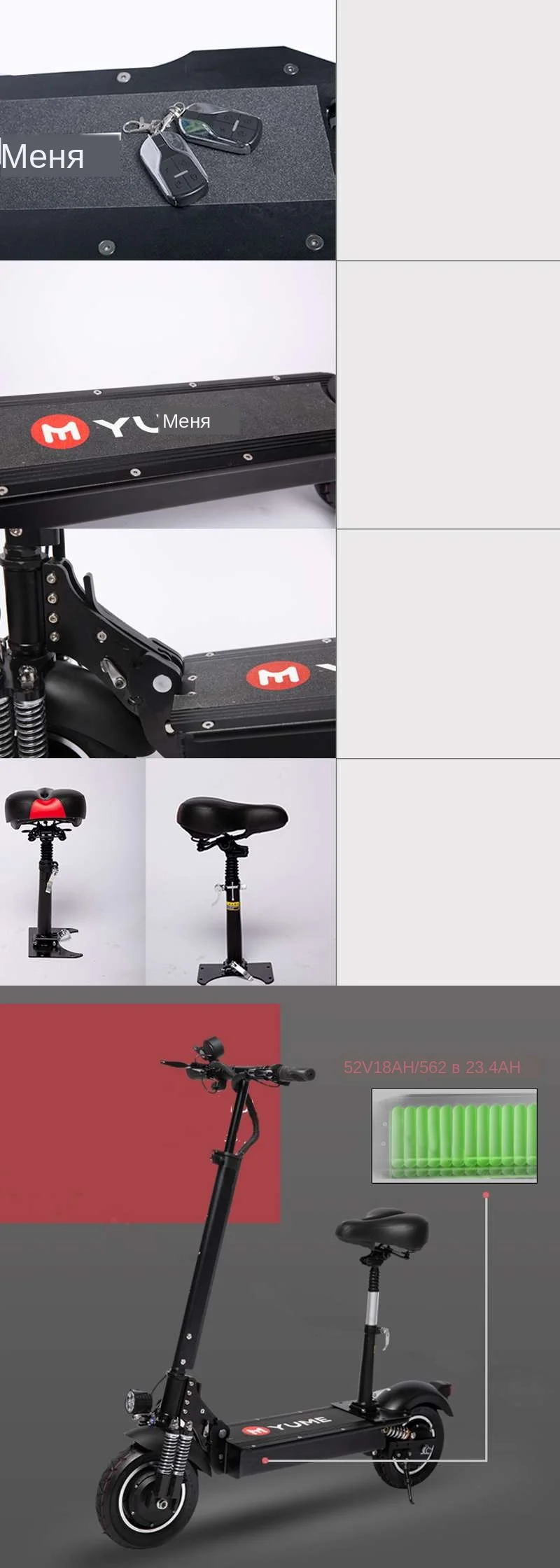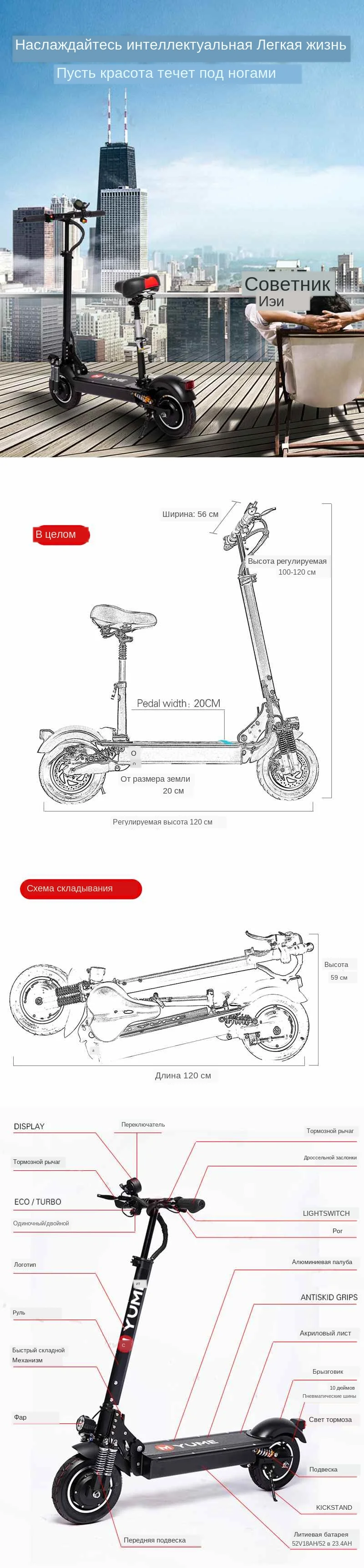 Бренд YUME YM-D4 + Размер Общий размер (мм) 1150*230*410 мм Размер после складывания (мм 1130*1310*570 мм Размер коробки (мм) 1230*320*520 мм Вес Максимальная загрузка (кг) 200 кг Вес брутто (кг) 38 кг Вес нетто (кг) 32кг Скорость Максимальная скорость (км/ч) 65-75 км/ч Дистанция поездки (км) 65-80 км Класс способность Под углом 45 градусов Рабочая температура -10℃ ~ 40 ℃ Батарея Батарея типа Литиевая батарея Напряжение батареи (в) 52 V Емкость аккумулятора (Ач) 18 Ач или 23,4 Ач Мотор Тип двигателя Бесщеточный двигатель постоянного тока Мощность двигателя 1000 ватт * 2 мотора Номинальное напряжение 52 V Зарядное устройство Время зарядки 4-5 часов Другое Особенности Размер шин 10 дюймов пневматические шины Материал рамы Алюминиевый сплав Подвеска Пружина подвески Дисплей Цвет дисплей Скорость вверх Дроссельной заслонки Стоп-сигнал Передний и задний дисковый тормоз Цвет Черный
