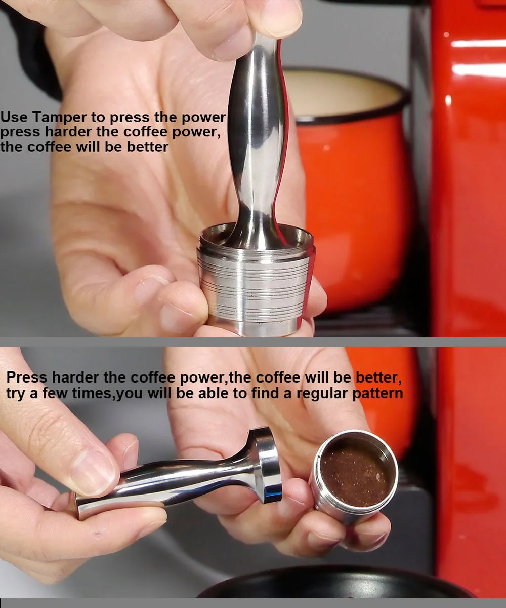 Торговая марка:Dalinwell,100% новые и высококачественныеМногоразовая капсула nespresso,Плоское основание из нержавеющей стали, экономия труда и даже при тампоне кофе.