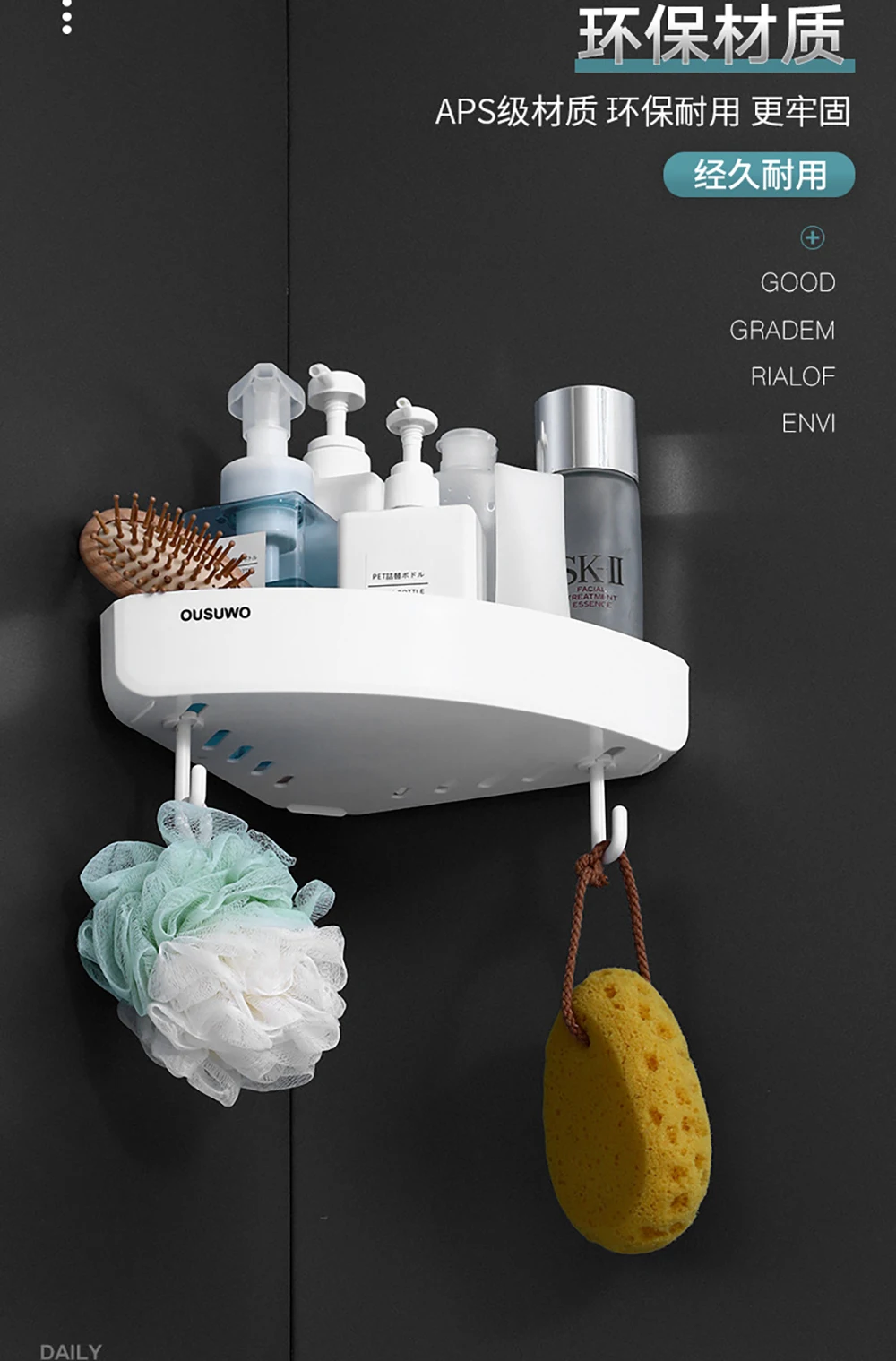 Описание продукта: Я буду рекомендовать вам полезный Душ caddy. Это может решить проблему хранения душа. Материал ABS хорошо отполирован, он прочный и содержит много вещей, таких как очищающее средство для лица, лосьон для крема, мыло и зубная паста, что обеспечивает полное использование пространства для ванной комнаты и обеспечивает аккуратность и организованность столешницы. Особенности -Материал: АБС-пластик. -Самоклеящаяся конструкция, без сверления, без гвоздей, не требует дополнительных инструментов. -Просто Наклейте наклейку на гладкую поверхность и Повесьте полку. -Он прочный и вмещает много вещей, таких как очищающее средство для лица, лосьон для кожи, мыло и зубная паста. -Вода будет вытекать из небольшого отверстия на дне этого держателя. -Кроме того, вы можете повесить влажное полотенце или повязку на крючок. Упаковочный лист 1 х ванная комната угловая полка
