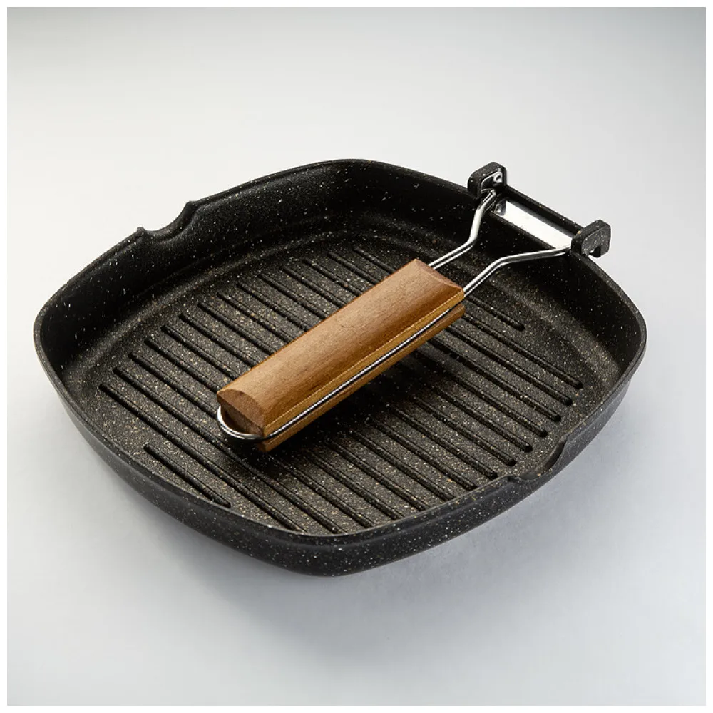 Pan grill made of cast aluminum with non-stick coating series Black Onyx High quality eco-friendly inner marble non-stick coating External high strength heat resistant marble coating 4mm thick bottom guarantees strength and high Cooking efficiency Wooden folding handle with open flame protection Suitable for cooking with small amount of oil It is forbidden to wash in the dishwasher Can be used on electric, gas, ceramic, halogen plates Do not use on induction cookers! Color: Black Marble