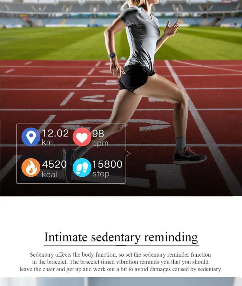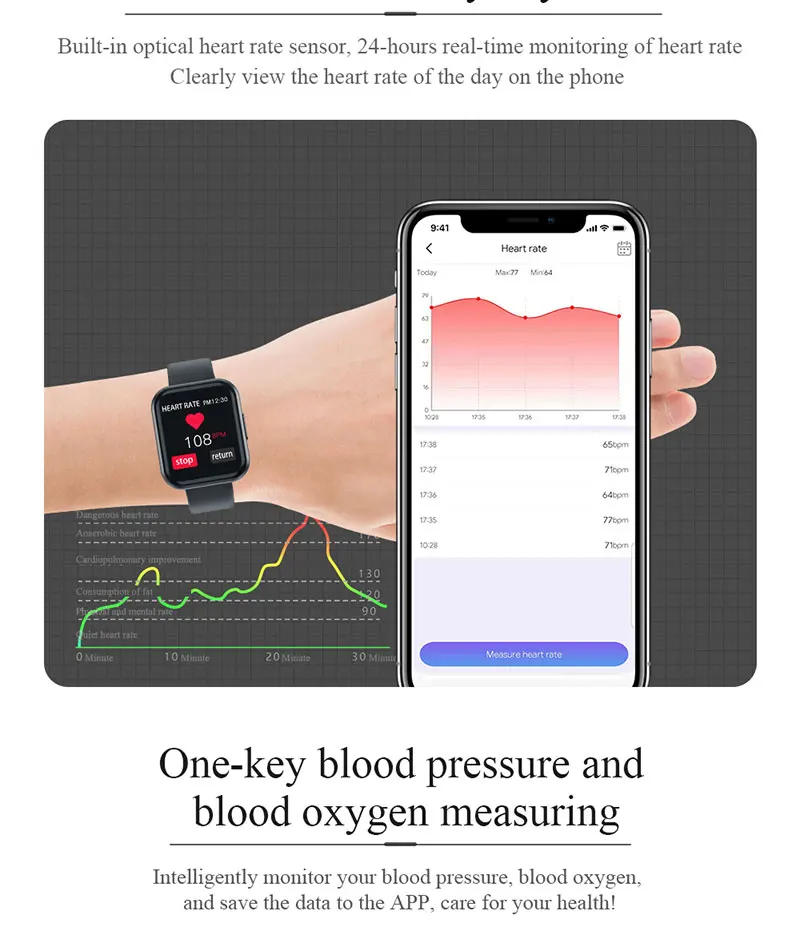 Основные Функция: Мониторинг здоровья: динамическое и статическое кровяное давление, динамический и статический кислород в крови, динамический и статический пульс, контроль усталости, мониторинг сна, подсчет шагов, потребление калорий, расстояние, напоминание о сидячем положении Другие функции: входящие звонки и SMS напоминают, время, тихий будильник, управление музыкой Характеристики дисплея: 1,3 TFT цветной экран разрешение 240*240 Тип батареи: полимерный аккумулятор Зарядка: 5,0 в разъем для зарядки 1A или ниже 1A Метод зарядки: метод электромагнитной зарядки Тип двигателя: плоский двигатель В режиме ожидания потребеление энергии: в режиме ожидания в течение 25 дней, при нормальных условиях эксплуатации в течение 6-8 дней (180 мАч аккумулятор) Тип Bluetooth: Bluetooth 5,0 Шрифт пуш-ап Категория: multi-язык шрифтами Емкость аккумулятора: 170 мАч Язык отображения: упрощенный китайский, английский Язык браслета: упрощенный китайский, английский, немецкий, французский, португальский, испанский, русский, тайский, итальянский, японский Прикладные языки: упрощенный китайский, традиционный китайский, английский, японский, корейский, тайский арабский, немецкий, русский, испанский, португальский, французский, Спортивная запись: шагомер, время работы, пройденное расстояние в милях, расход калорий, мониторинга сна, сохранить 30 дней упражнений/sleep (Пробуждение/спящий режим) для передачи данных Мониторинг здоровья: в режиме реального времени сердечный ритм измерение (динамическое, статическое), измерять кровяное давление измерения (установленное время измерять кровяное давление измерения), уровня кислорода в крови, отслеживание усталости Умные напоминания: умные напоминания: Настраиваемые напоминания о тревоге, необходимые напоминания, напоминания о звонках, информация Push (SMS / QQ / WeChat / Skype / Facebook / Twitter) /Линия/WhatsApp / LinkedIn / Instagram / TIM / SnapChat Другие функции: поверните наручный светильник на занавес, физический осмотр одной кнопкой, отображение времени, удаленная камера, установите режим «Не беспокоить», найдите браслет, горизонтальный и вертикальный экранный переключатель, настройте домашний режим, отклонение звонков, поддержка обновления air APP, функция передачи и переключение запястья, отслеживание (запуск/Прогулка/езда), Регулярно Отслеживайте артериальное давление и автоматически калибруйте частоту сердечных сокращений.