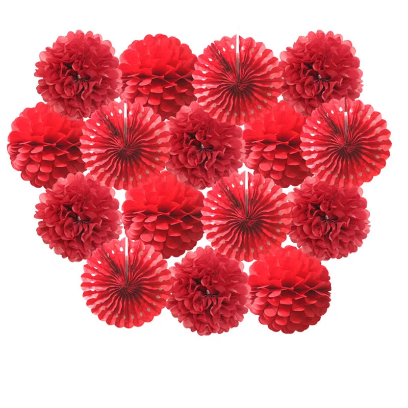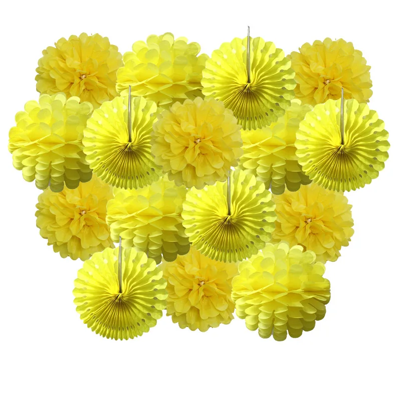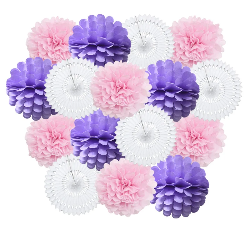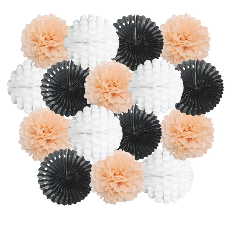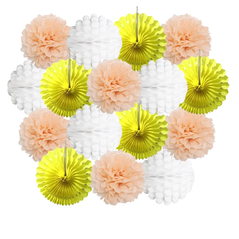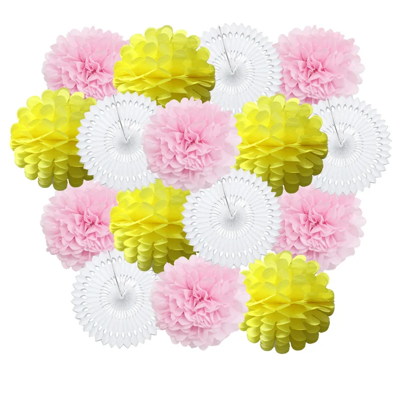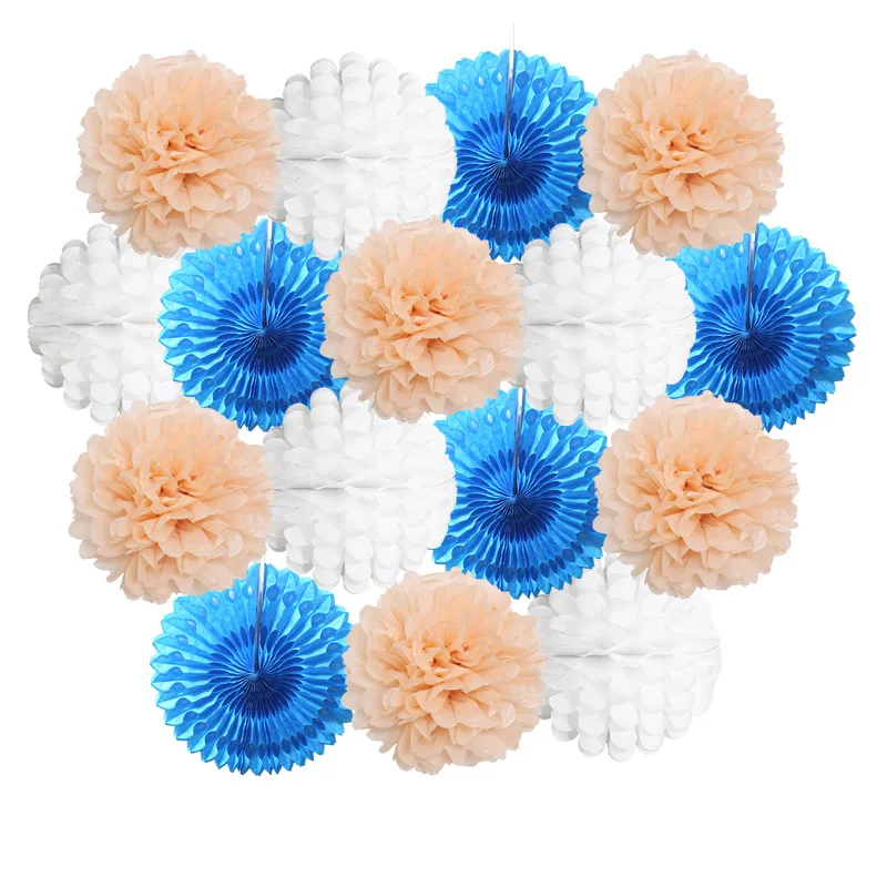 Size:6inch(15cm)/8inch(20cm) /10inch(25cm)/12inch(30cm) Material:Paper Package: 1set=5pcs paper-fans+5pcs paper flower lantern+6pcs paper pom pom