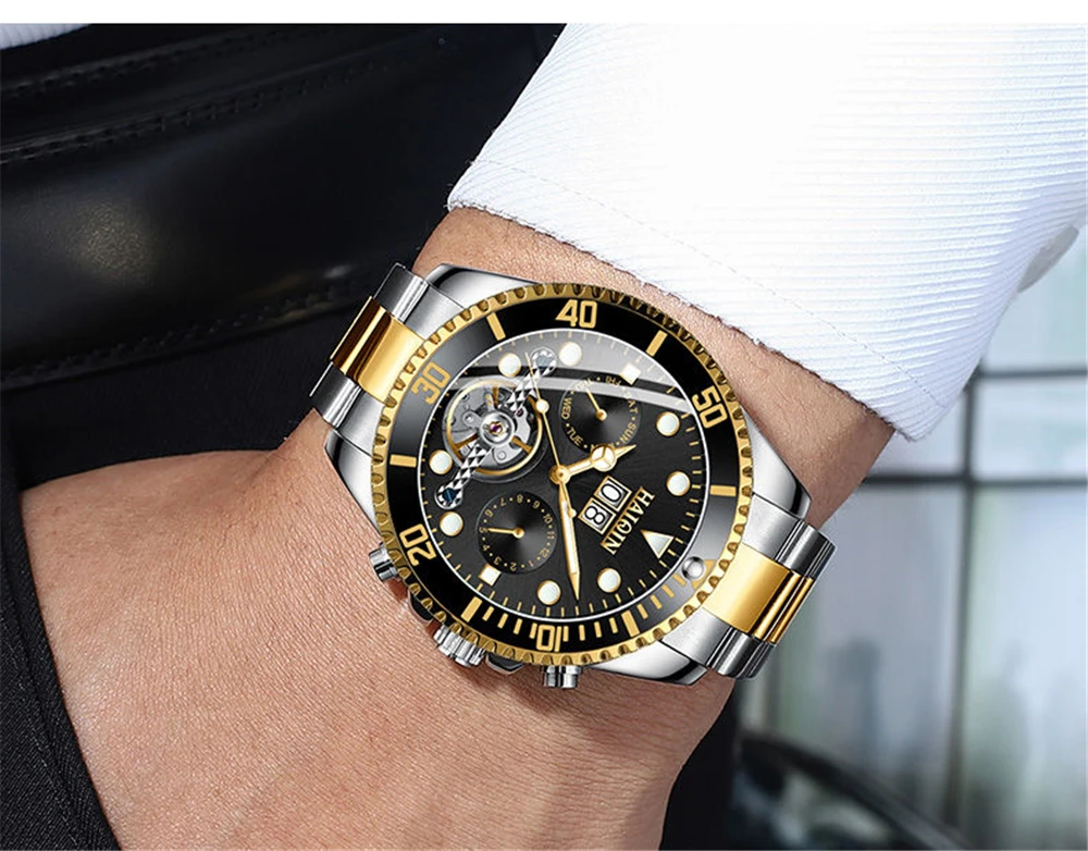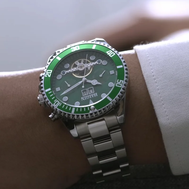 Automatic watches for men, Week display, month display, complete calender (There is a day of the month window at the top) and a tourbillon on the green dial, Fits Wrist Size 4.5in - 8.2in Original automatic mechanical movement with analog display, Designed for accuracy,and longer service life. Emerald green dial and luminous pointers (need to absorb light energy storage or exposed to the sunlight) in the delicate alloy watch case, flexible stainless steel strap can provide comfortable wearing experience; In order to prevent the watch from being scratched, we added a plastic film to the surface. 100m Water resistant (328ft), In general, suitable for professional marine activity and serious surface water sports, but not scuba diving Prime Sale Day-Very unique dress watch , suitable for business, sports and other more occasions. We provide 30 days free returns, 1 years product quality assurance for the mechanical watch