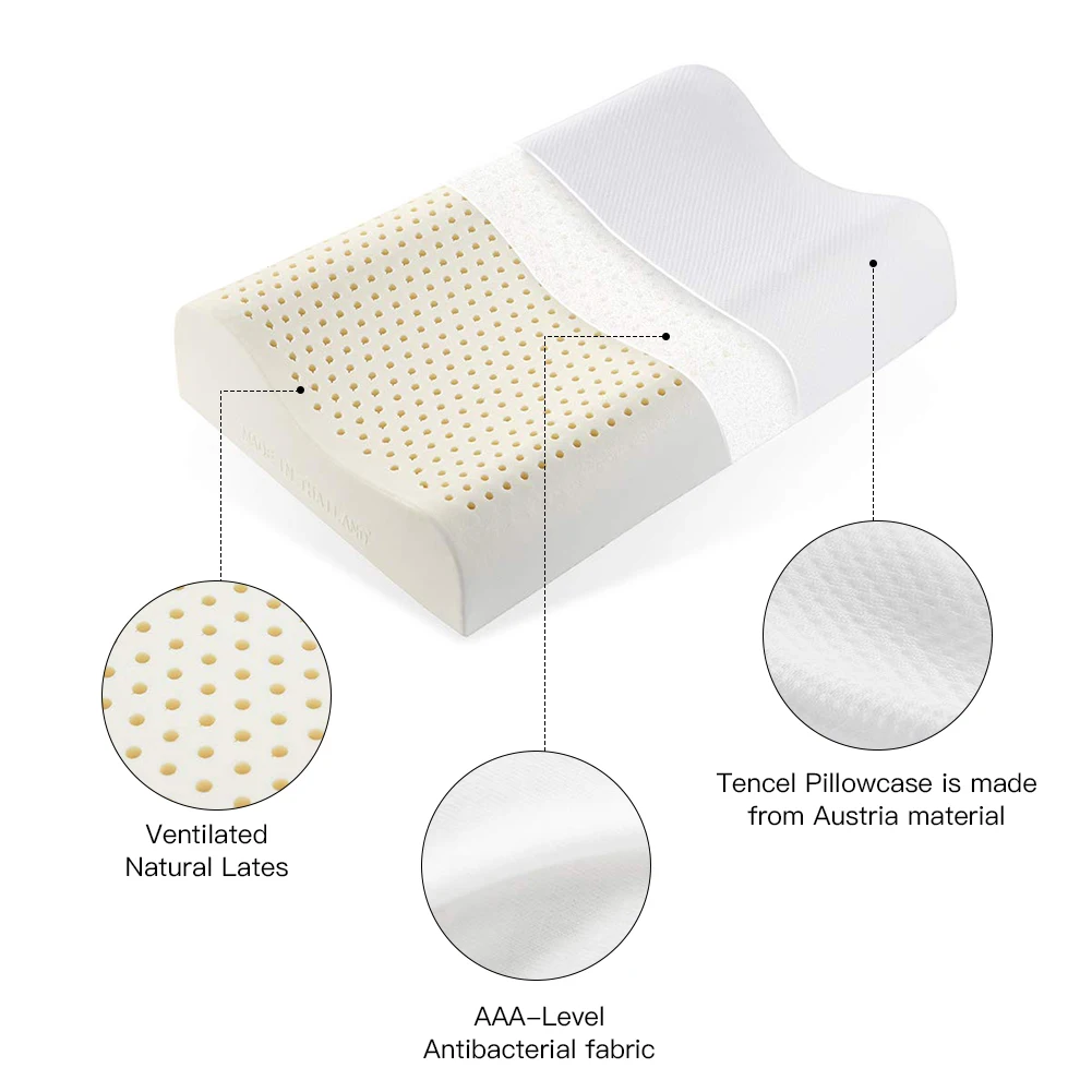 1. Контурный дизайн и сброс давления: натуральная латексная подушка, Эргономичная конструкция, обеспечивающая максимальный комфорт, уменьшая давление на голову и шею и снимающая боль в плечах и спине, вызванную длительной работой;