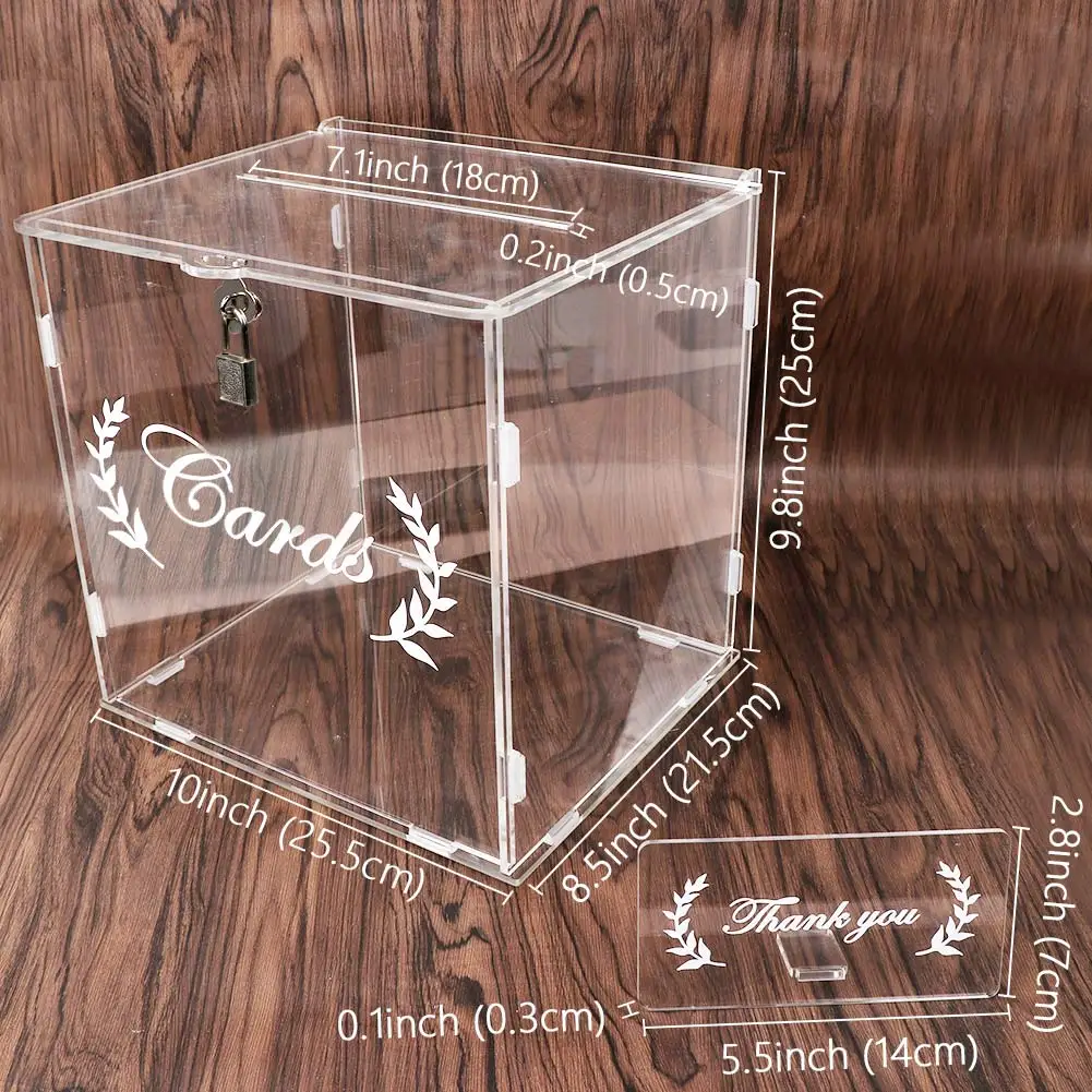 Материал: акрил Цвет: прозрачный Складная конструкция легко собирается, и вы получите счастье своими руками. Вы также можете покрасить его в любой цвет, который вам нравится С замком (двумя ключами) более безопасно для защиты денег или карт Размеры Размер коробки: 10 дюймов x 9,8 дюймов x 8,5 дюймов Знак: 5.5in x 2.8in x 0.1in. Вес: 1466 г (3,23 фунта)