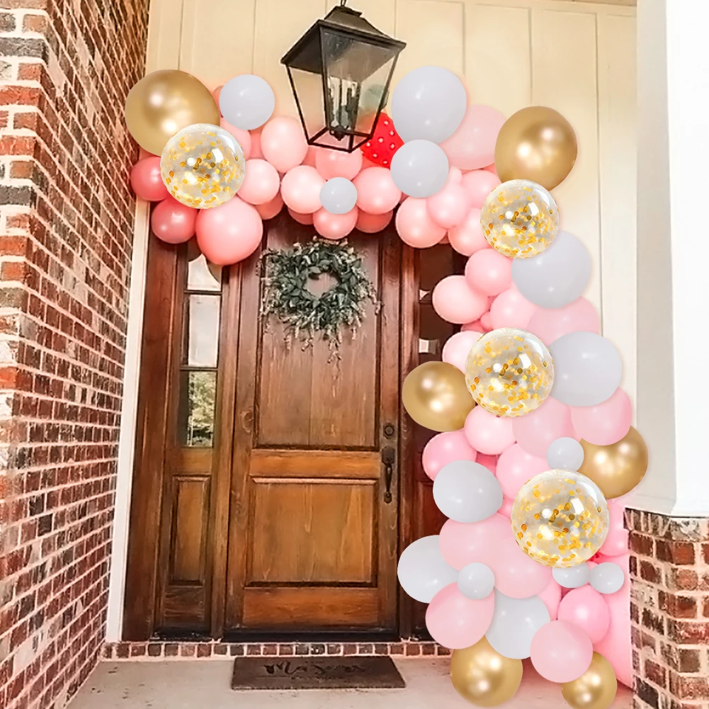 120 посылка включает: (20 штук 12in белый латексный воздушный шар + 20 штук 10in белый латексный воздушный шар + 30 шт. 5in белый латексный воздушный шар + 10 шт. 12in розовый латексный воздушный шар + 20 штук 10in розовый латексный воздушный шар + 10 шт. 10in воздушный шар "Конфетти" + 10 шт. 12in золотистый воздушный шарик в);