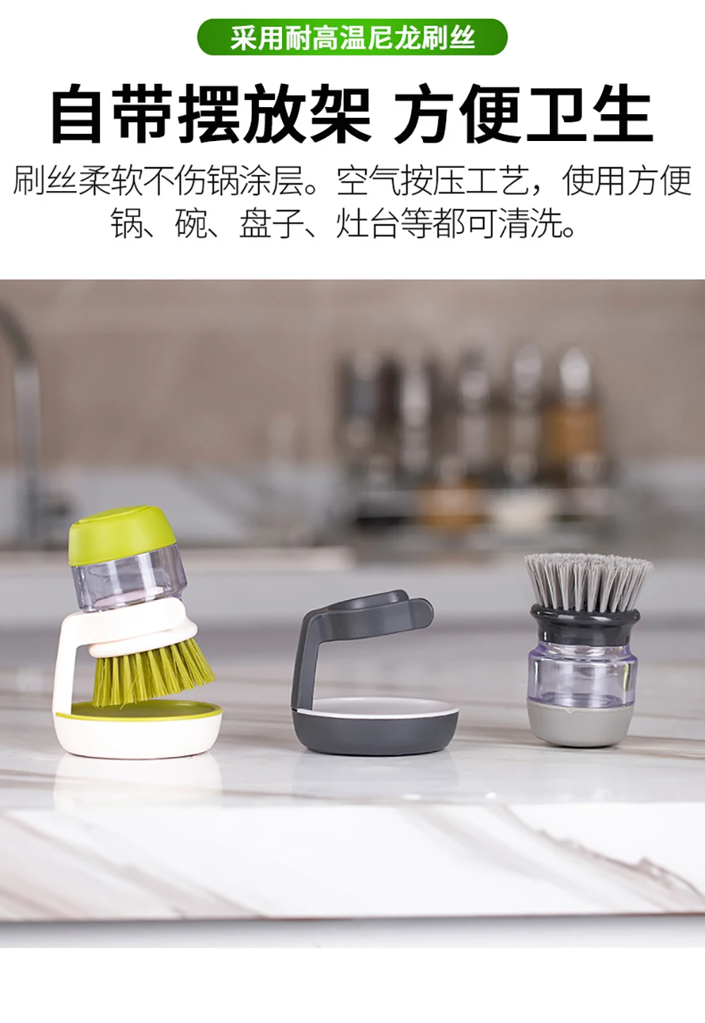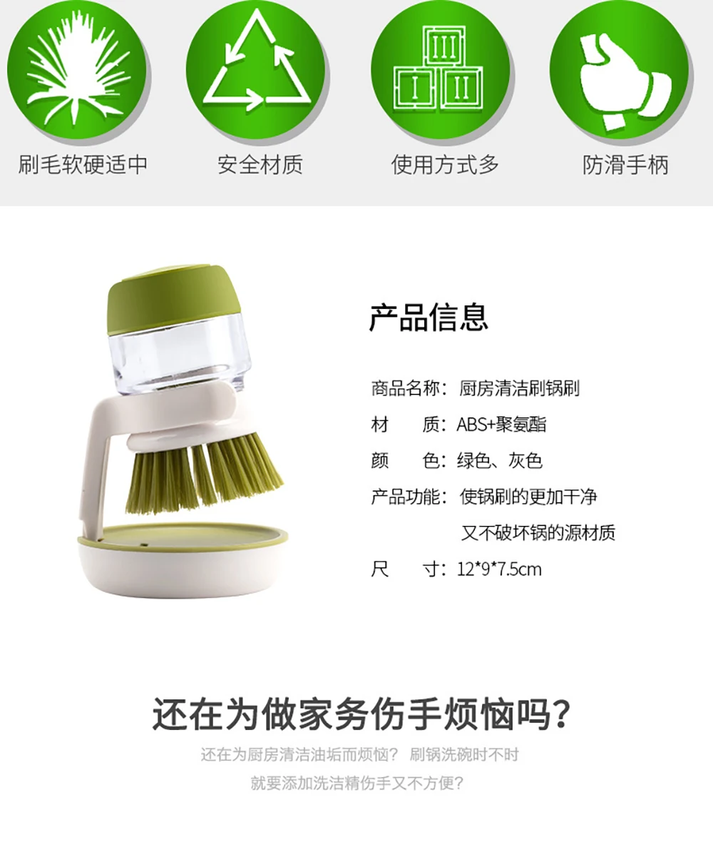 Краткое содержание: конструкция для хранения жидкости прижимает жидкость, щетина из полипропилена, мощность очистки сильна, различные материалы легко мыть, а посуда не повреждается, что помогает вам утешить время после еды.