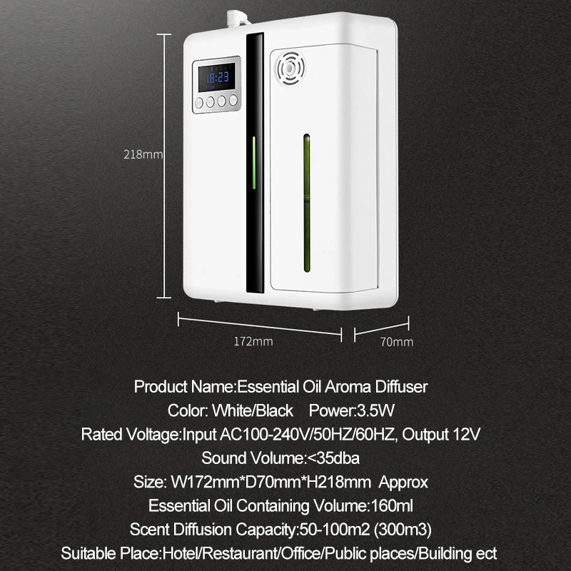 Название продукта: арома-диффузор с эфирным маслом Цвет: белый/черный Номинальное напряжение: вход AC100-240V/50 Гц/60 Гц, выход 12 В Мощность: 3,5 W Громкость звука:<35dba Размер: w172мм * d70мм * h218мм прибл. Объем эфирного масла: 160 мл Объем диффузии аромата: 50-100m2 (300m3) Подходящее место: Отель/ресторан/офис/общественные места/здание и т. Д.