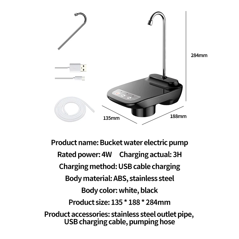 Название продукта: ковшовый водяной Электрический насос; Номинальная мощность: 4 Вт; Фактическая Зарядка: 3 ч; Способ зарядки: usb-кабель для зарядки; Материал корпуса: АБС-пластик, нержавеющая сталь; Цвет корпуса: белый, черный; Размер изделия: 135*188*284 мм Вспомогательное оборудование продукта: нержавеющая сталь выпускная труба, usb-кабель для зарядки, насосная шланг