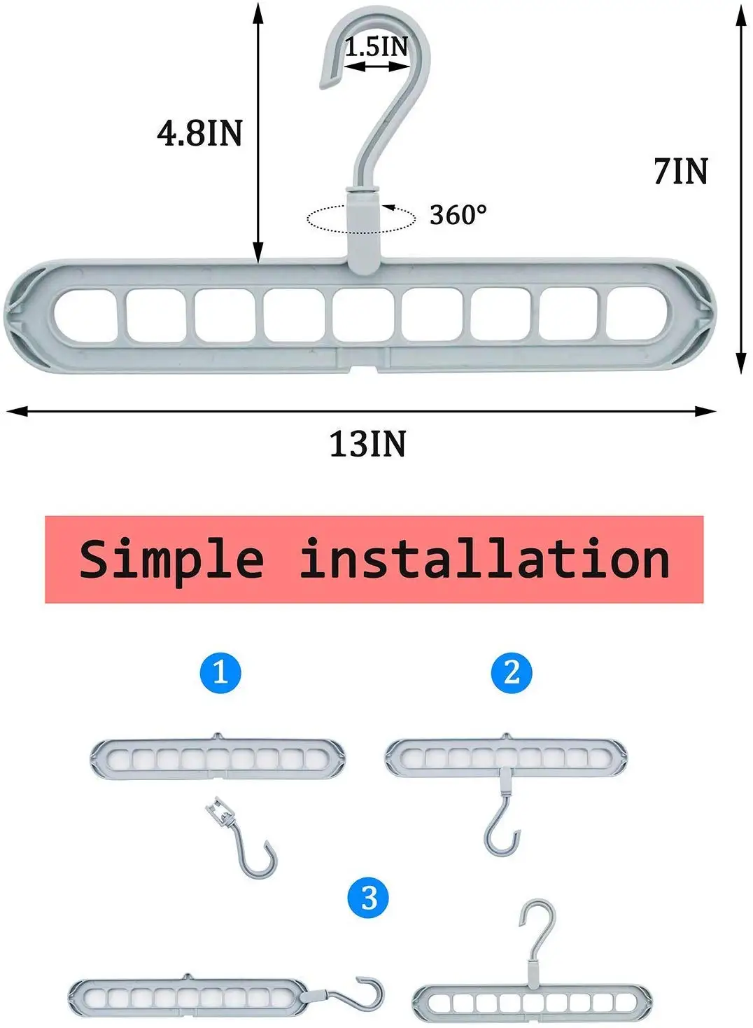 Информация о продукте: Цвет: случайный цвет Размер: 33х7 см Материал: полипропилен Характеристика: Материал: Изготовлен из высококачественного полипропиленового материала, прочный и долговечный Дизайн: 9 отверстий в одной стойке для хранения, которая поддерживает 9 вешалок, равномерно распределенных вешалок для одежды Удобно использовать: подвесная головка может вращаться на 360 градусов, поэтому ее можно использовать свободно Применение: идеально подходит для сокращения, общежития и квартиры с ограниченным пространством Хороший органайзер: с уникальным канавкой, можно свободно регулировать по вертикали и горизонтали Посылка включает в себя: 1 шт. вешалки для одежды