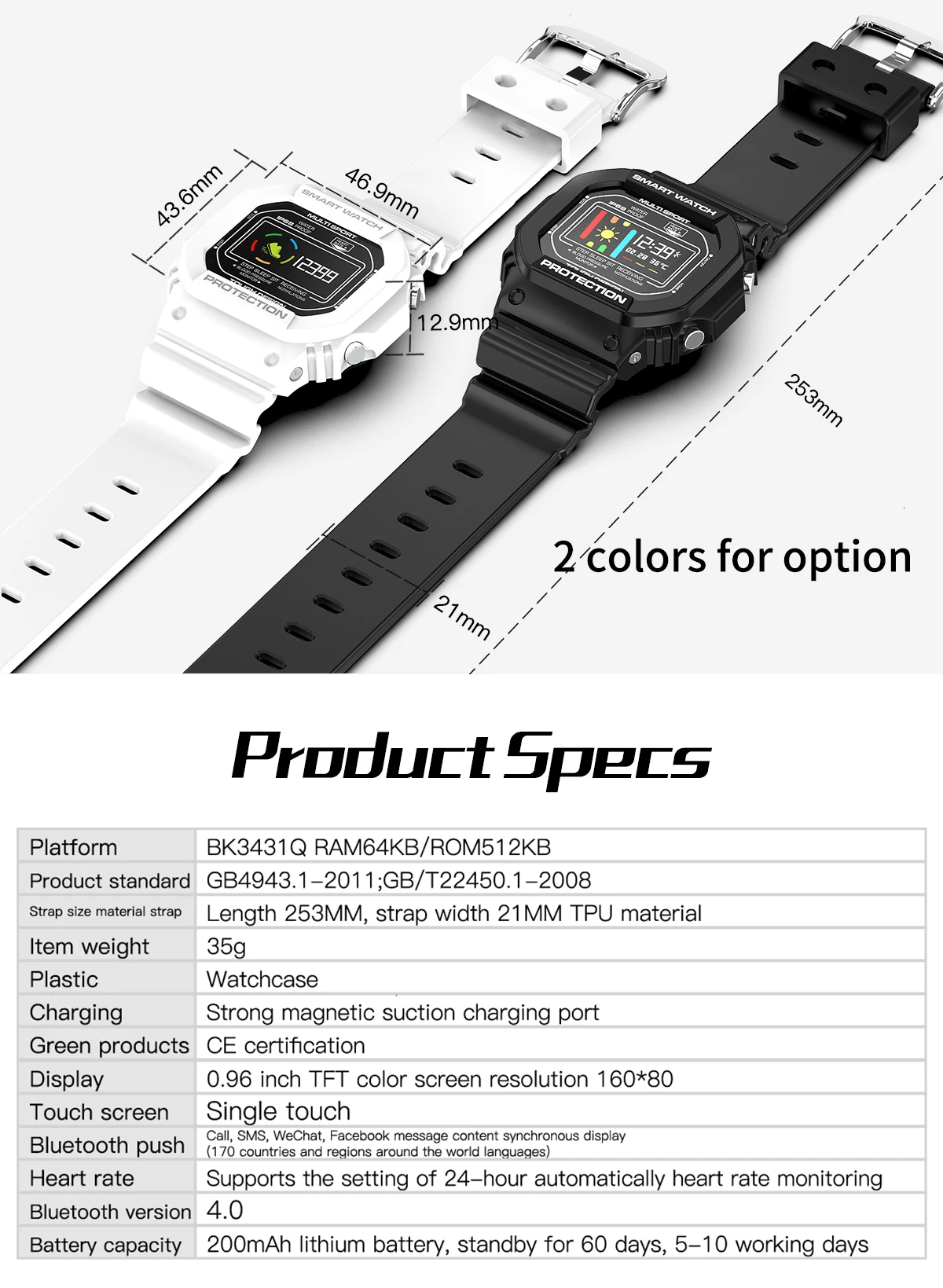 Пульсометр ЭКГ кровяное давление кислородный сон, подсчет шагов, синхронизация букв дисплей, отказ от вызова, Bluetooth Камера IP68 водонепроницаемый и т. Д. Чехол: пластик Ремешок: ТПУ Подставка для зарядки: сильный Магнитный зарядный интерфейс Экологически чистые продукты: CE имеет квалификацию Основной экран: цветной tft-экран 0,96 дюйма Разрешение: 160*80 Сенсорный экран: одно касание Функция Bluetooth и версия: Bluetooth 4,0 Размер и емкость батареи: 200 мА полимерная литиевая батарея Вибрационный Мотор: Поддержка Язык синхронизации информации: Поддержка 170 стран и региональных языков Внимание: пульс продукта, кровяное давление, ЭКГ и так далее функции, результаты теста только для справки, потому что не медицинское оборудование, точность не гарантируется!