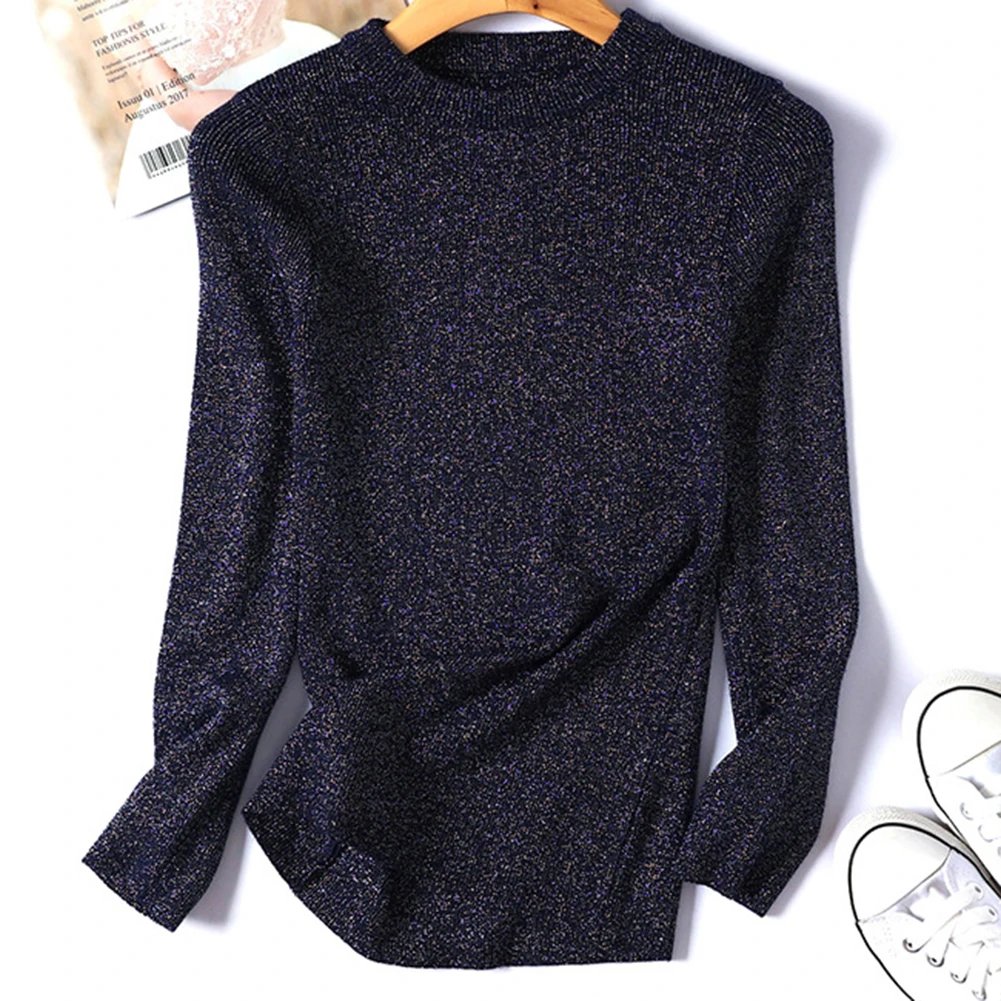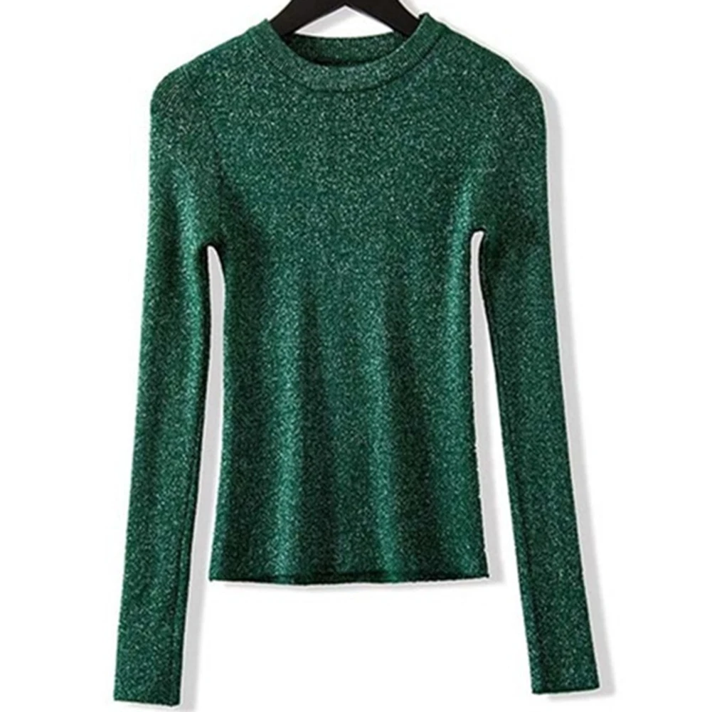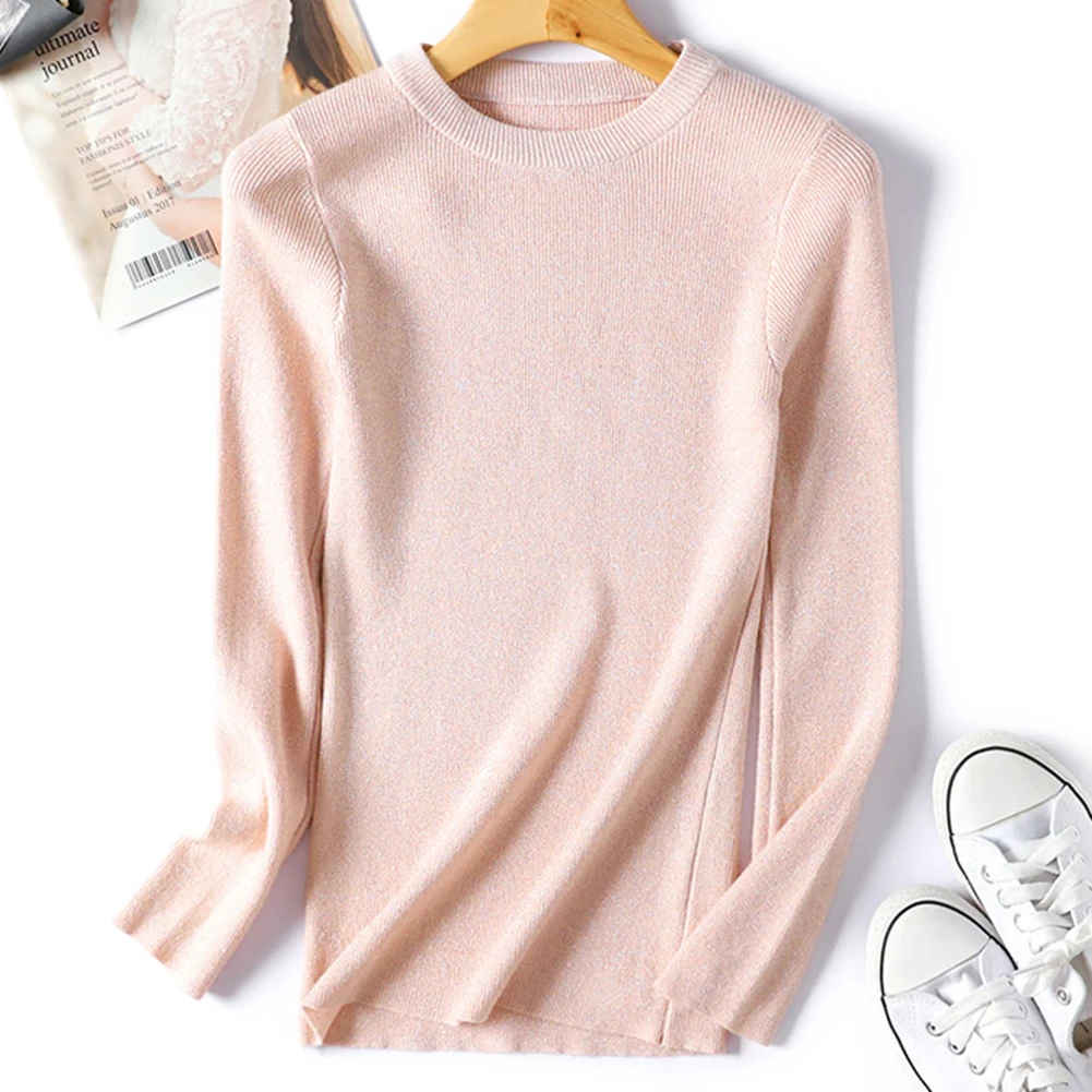 Модный однотонный Блестящий женский свитер, пуловер с круглым вырезом, базовый обтягивающий трикотажный топ