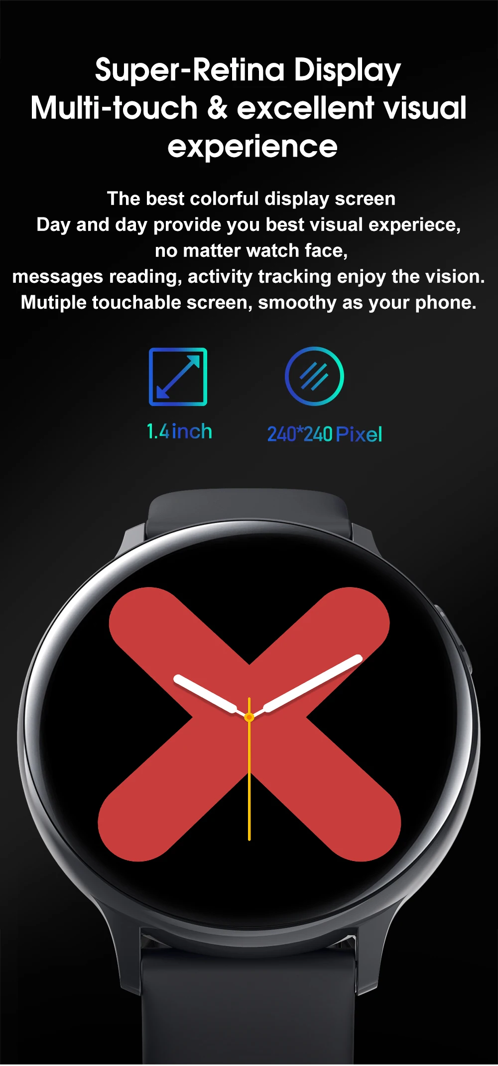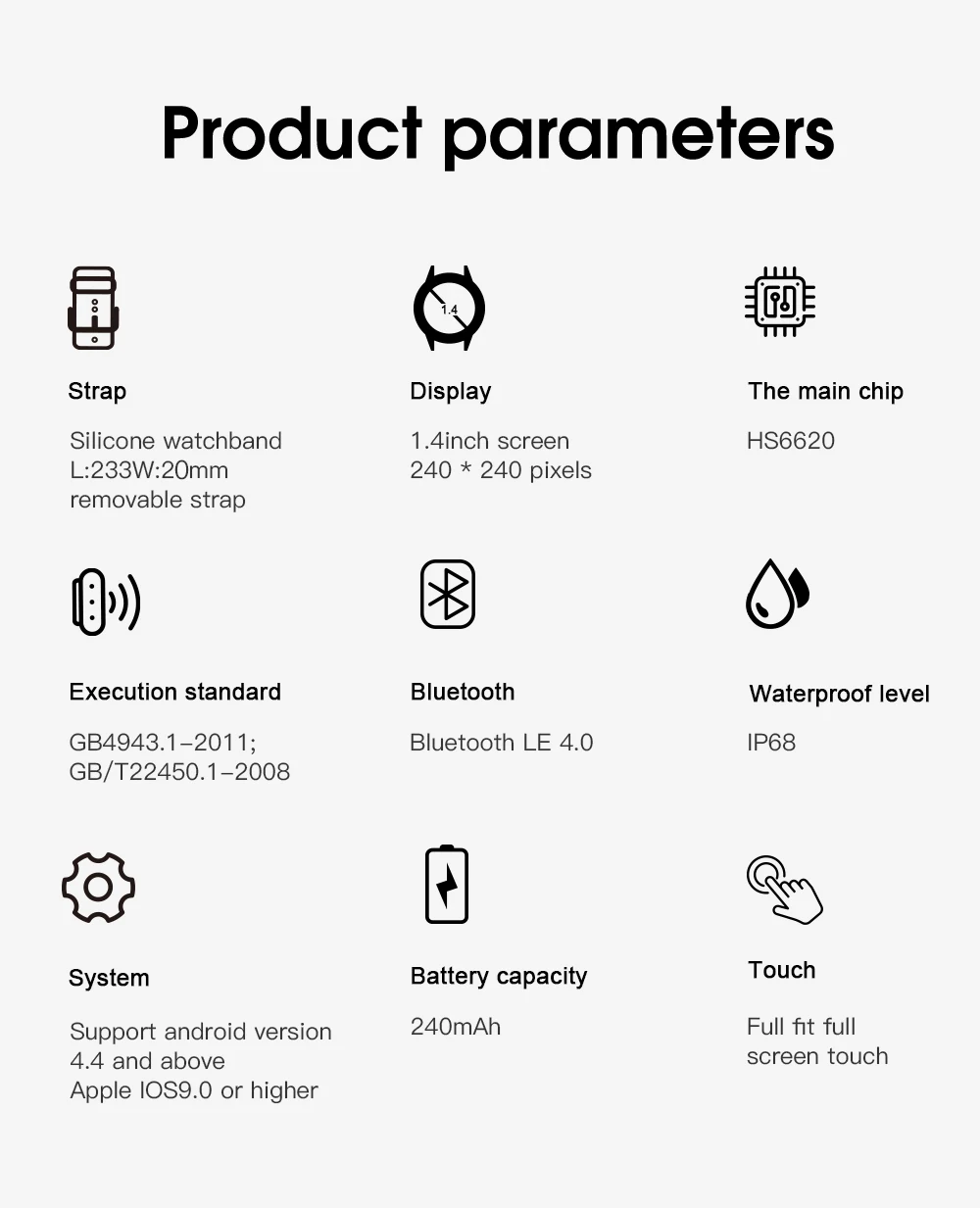 Параметры продукта: Особенности * Платформа: HunterSun HS6620D * Справочный Размер машины: 44*44*12 мм, с ремешком 230 мм * Вес машины: Одна Головка 50 г * Чехол Материал: сплав чехол, алюминиевая рамка, Пластик сзади чехол. * Материал ремешка: силикон * Аккумулятор: 230 мА · ч, Время работы батареи 7 дней * Цвет: черный, серебристый • Главный экран: 1,4 TFT площади экрана 240*240 * Разрешение: 240*240 * Сенсорный экран: Full Touch * Функция Bluetooth и версия: Bluetooth 4,0 * Водонепроницаемый: IP68 Водонепроницаемый (пожалуйста, не трогайте горячую воду) * Приложение: Fundo pro Особенности: ЭКГ Время поддержки Поддержка нескольких часов Шаг поддержка Калорий поддержка Расстояние Поддержка Спорт, то значит, вы согласны с нашей политикой использования куки и технологии Поднимите руку, чтобы осветить опору Мониторинг сна поддержка Беговая дорожка с сборным механизмом поддержки Напоминание поддержка Поддержка уведомлений Функция напоминания о необходимости двигательной активности поддержка Сигнализация напоминание поддержка Сделайте снимок при встряхивании поддержка Найти опору для браслета Поддержка нескольких часов Несколько языков: китайский, английский, русский, испанский, , Японский Поддержка измерений в реальном времени Движение WeChat поддержка Сердечного ритма поддержка Длительное сердцебиение, не поддерживает Измерять кровяное давление поддержка Оксиметр поддержка ЭКГ не поддерживает Термометр не поддерживает Еженедельные здоровый поддержка Поддержка bluetooth Язык поддержка Приложение Wearfit2.0 Способ зарядки: Магнитная Зарядка OTA update Поддержка Водонепроницаемый IP68 Посылка включает в себя: 1 * умные часы 1 * зарядный кабель 1 * Руководство пользователя