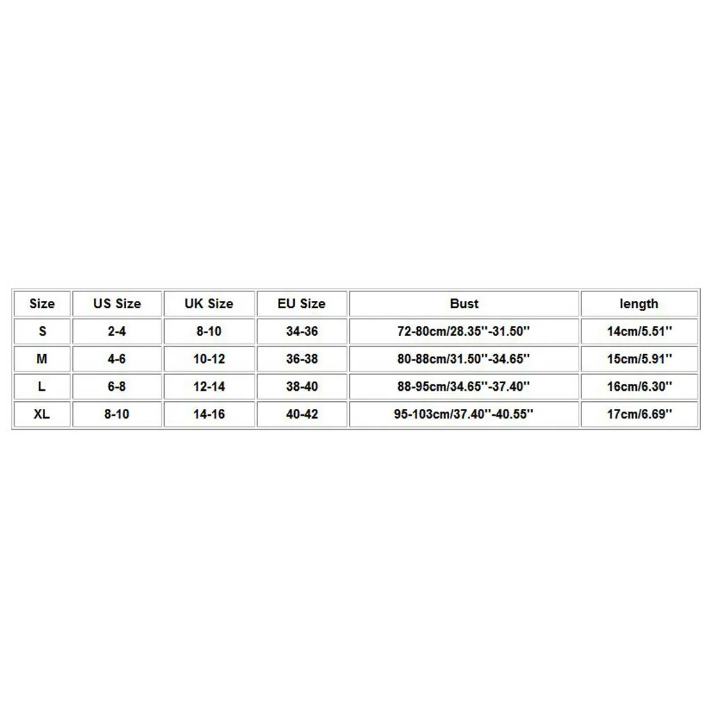 Размеры Размер США Размер Великобритании Размер ЕС Бюст Длина S 2-4 8-10 34-36 72-80 см/28,35 ''-31,50'' 14 см/5,51 дюйма М 4-6 10-12 36-38 80-88 см/31,50 ''-34,65'' 15 см/5,91 дюйма L 6-8 12-14 38-40 88-95 см/34,65 ''-37,40'' 16 см/6,30 дюйма XL 8-10 14-16 40-42 95-103 см/37,40 ''-40,55'' 17 см/6,69 дюйма