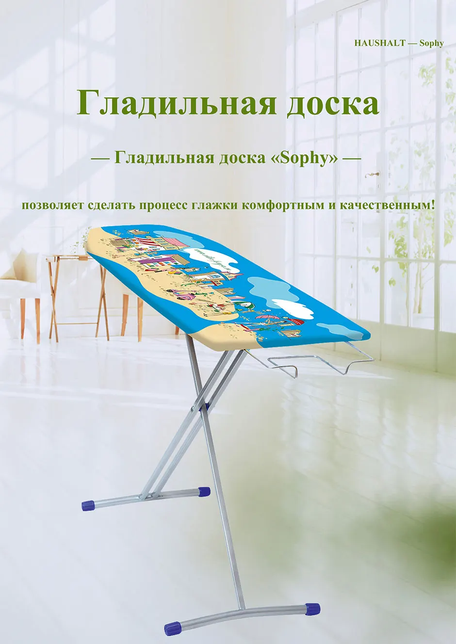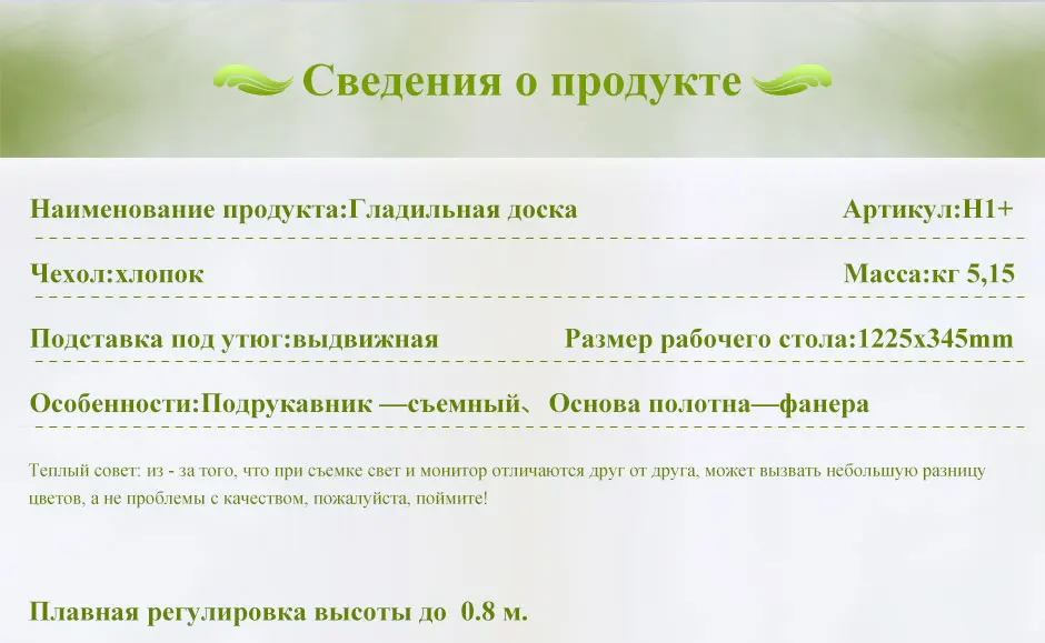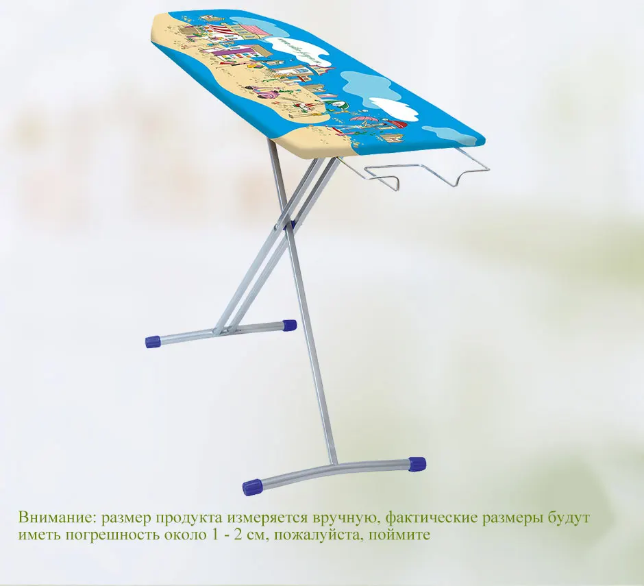 "1、Гладильный стол поверхность из ДСП, покрытый качественной х/б и тканью ярких расцветок. 2、металлическая ножка. 3、Пластиковые наконечники на опорах против скольжения и повреждения пола. 4、Плавная регулировка высоты до 0.8 м. 5、Выдвижная подставка под утюг. 6、Подрукавник съемный. "