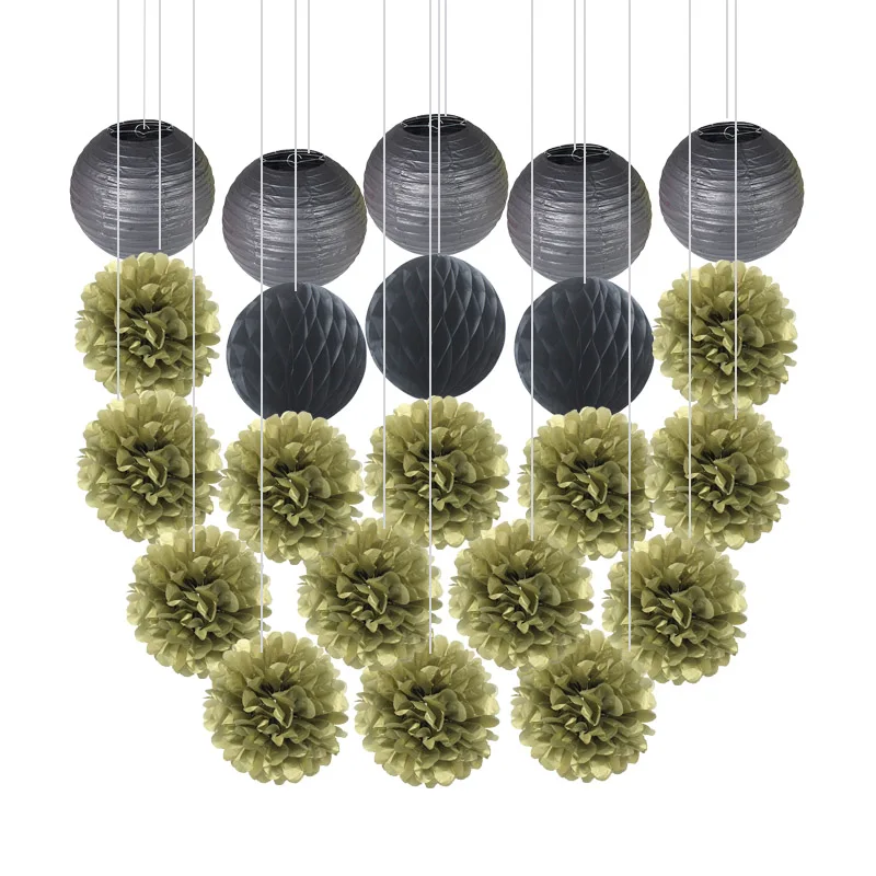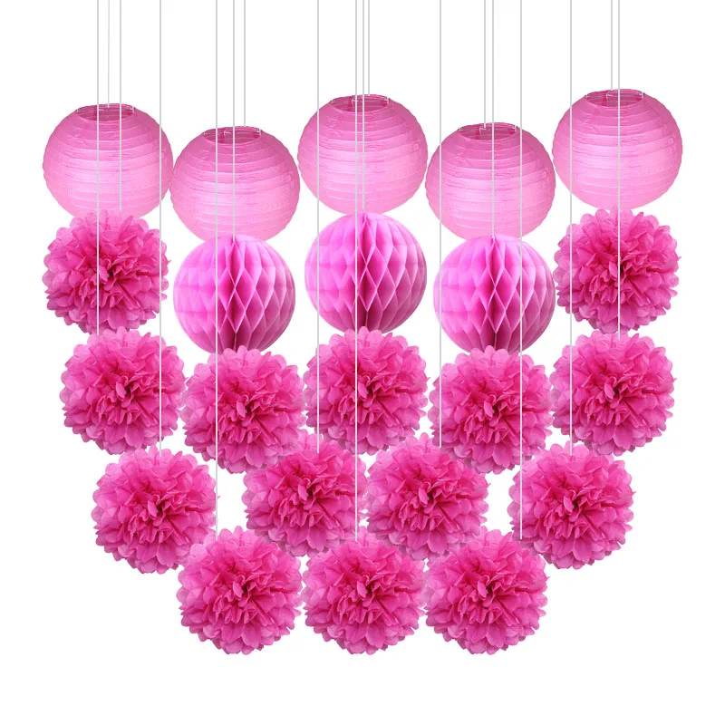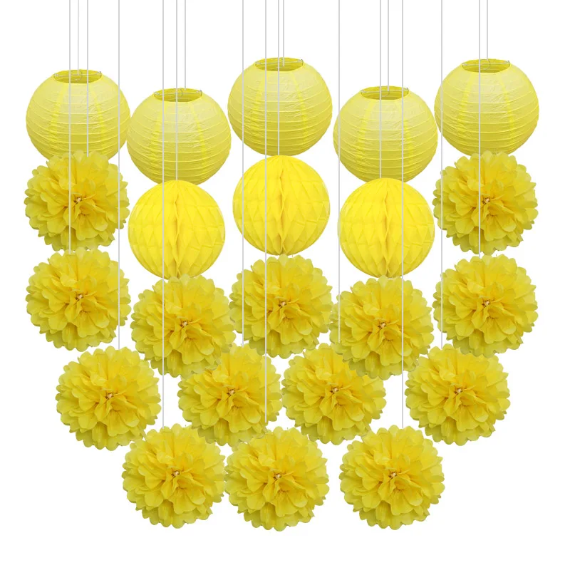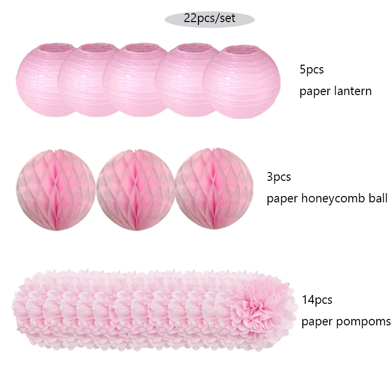 1 комплект = 5 бумажных фонарей + 3 сотовых шара + 14 бумажных помпонов.