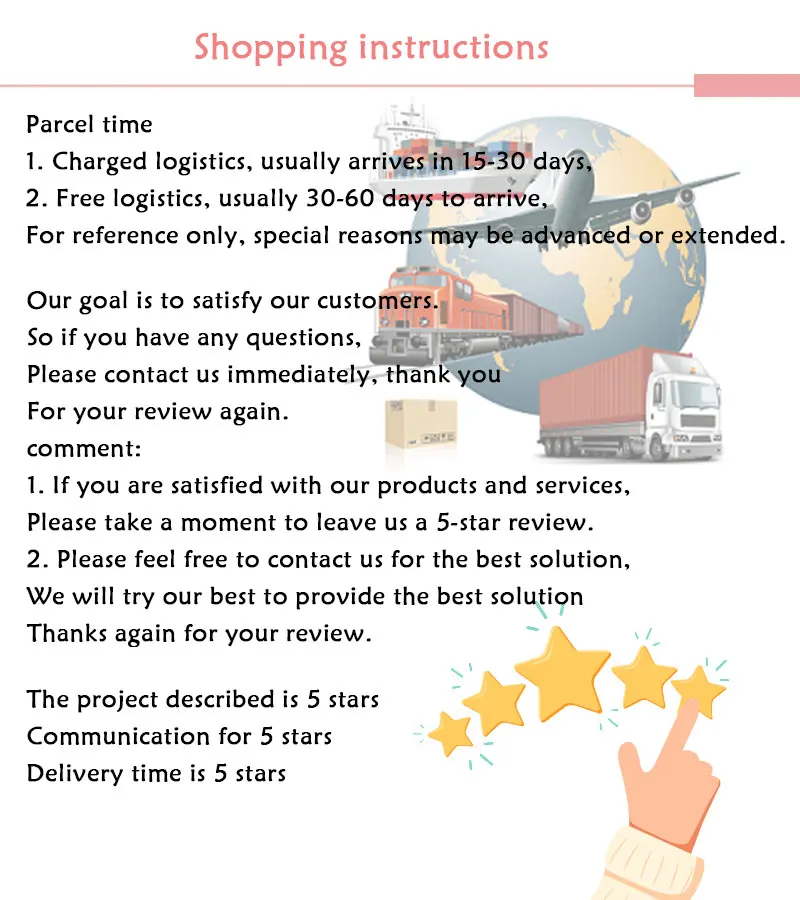 1. После получения посылка, если вы удовлетворены нашими продуктами и услугами, пожалуйста, оставьте отзыв с пятью звездами, и мы будем благодарны.