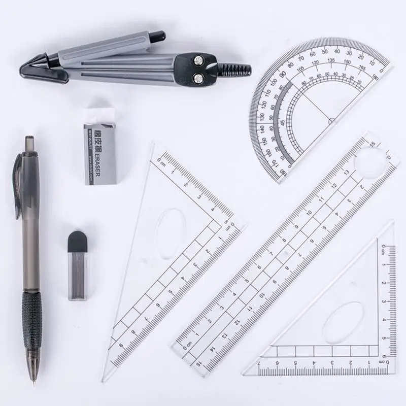 Посылка: 1 * линейка компаса для рисования; 1*0,7 мм автоматический карандаш; 1 * транспортир; 1 * ластик; 1*45 ° треугольная линейка; 1*60 ° треугольная линейка; 1*15 см линейка; 1*0,7 мм карандашный грифель с ручкой в форме рога единорога (10 шт.)