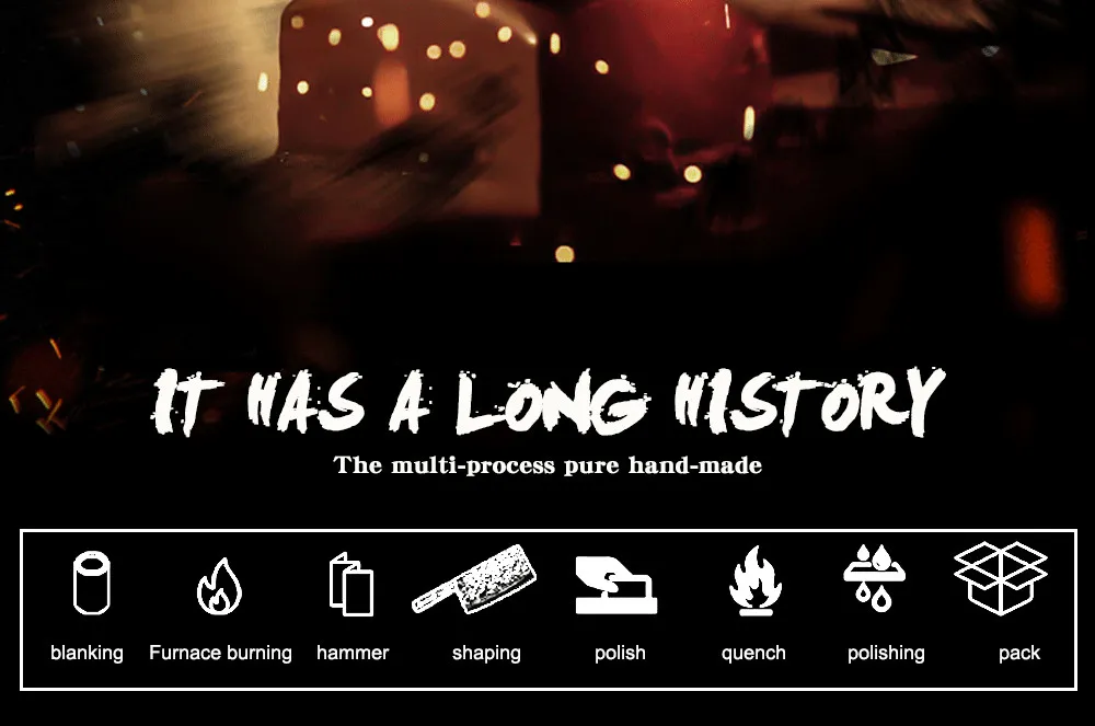 Особенности: Из-за закалки навыков, сделанных опытными работниками, и уникальной технологии формирования с различными способами нагрева, баланс между жесткостью и прочностью таких ножей является гарантией сделать их более прочными. Внимание: Кованые ножи отличаются высоким содержанием углерода. Внимание должно быть обращено на очистку, кислотные или щелочные вещества, которые не могут оставаться на лезвие в течение длительного периода. Такой нож необходимо вытереть после очистки. Некоторые кулинарные масла могут быть нанесены на них, если они не используются в течение длительного времени. И его необходимо поместить в сухое место для хранения. Посылка включает в себя: Как показано на картинке