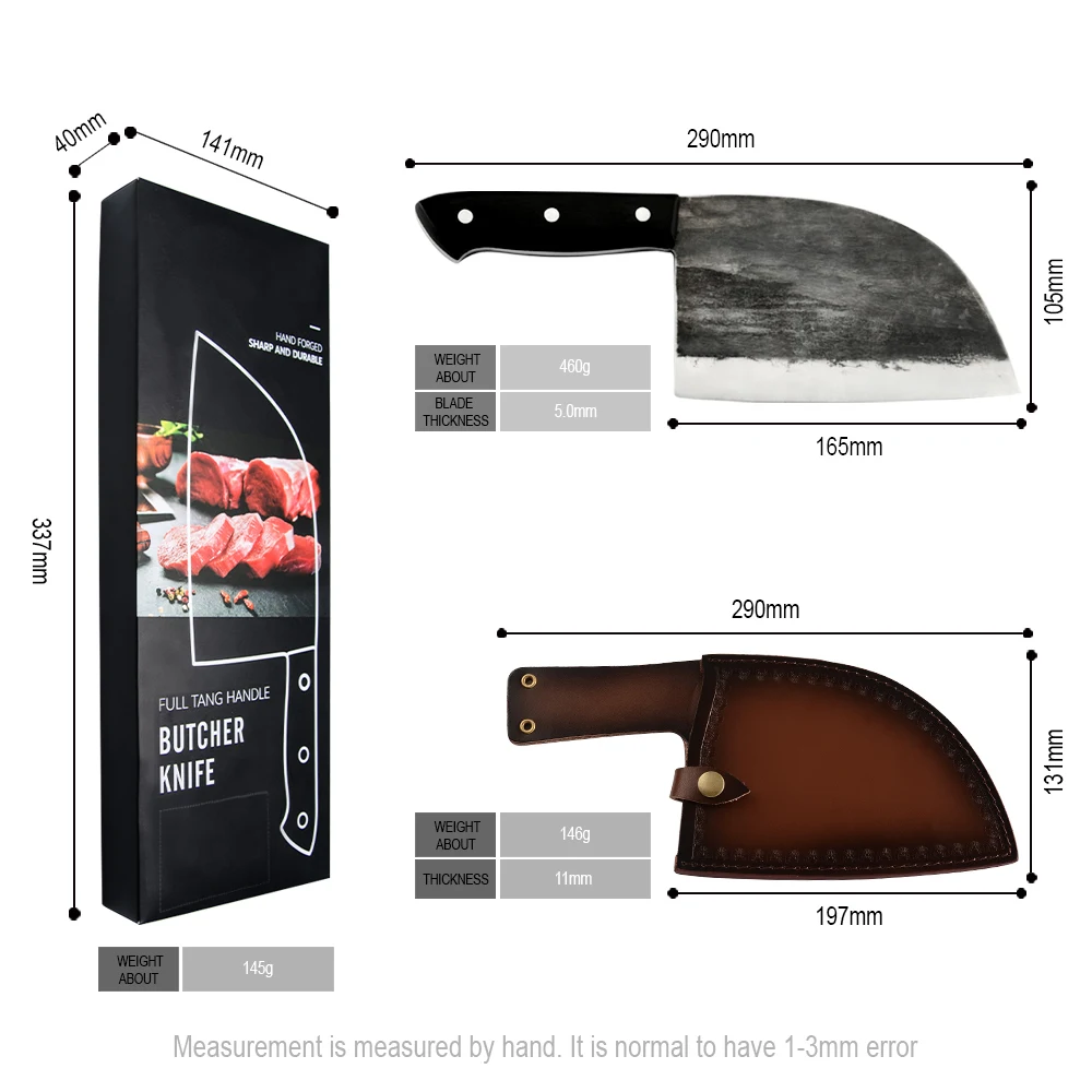 Ширина: 10 см Длина клинка: 17 см Вес: около 490 г Толщина клинка: 5 мм Материал: марганцевая сталь Разбрызгивание закалки: 780 градусов Закалка: 180 градусов-200 градусов Материал: Кованая Высокоуглеродистая сталь ручной работы Характеристики: бритва острая для легкой резки костей Рукоятка: полностью встроенный Стальной хвостовик + дерево + фиксация заклепок Процесс производства: при закалке-зажиме стали-закалке и других операциях непрерывного цикла.