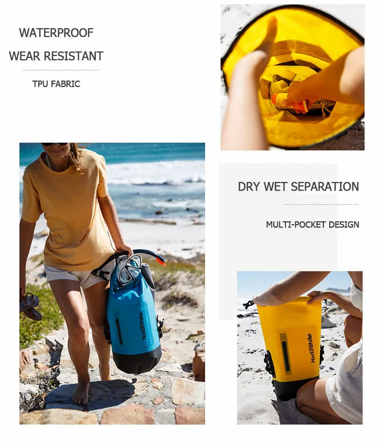 Торговая марка: Naturehike Название: водонепроницаемая сумка с сухой и влажной отделениями Материал: 420DTPU Цвет: желтый/синий/серый Емкость: 20л/30л/40л Вес: 410 г/520 г/600 г Размеры: 23*46 см/27*52 см/30*57 см Использование: Уличное плавание/дрейф/водные виды спорта