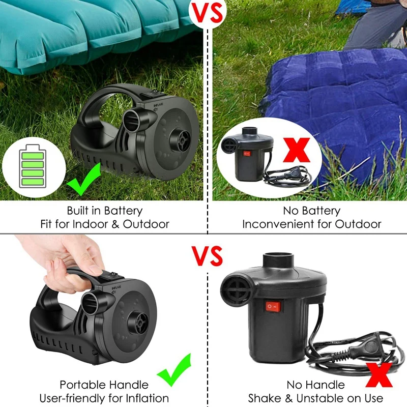[Перезаряжаемый и беспроводной]-надувной матрасный насос поставляется с адаптерами переменного и постоянного тока, что позволяет легко заряжать дома или в автомобиле. Вы можете использовать его в любом месте и в любое время. Аккумуляторы Ni-MH в этом перезаряжаемом насосе имеют более высокую производительность и более длительный срок службы батареи, чем другие обычные батареи.