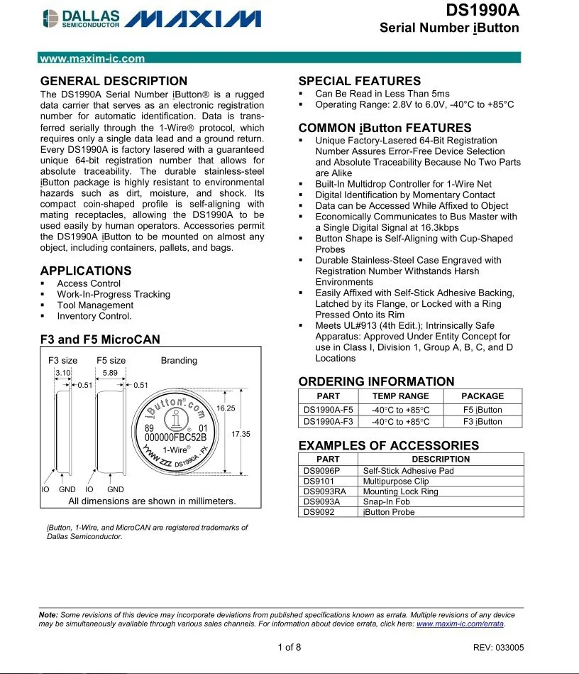TM1990A электронные ключи IButton Dallas TM ключ тег DS1990A F5 Немагнитный для контроля доступа электронный замок