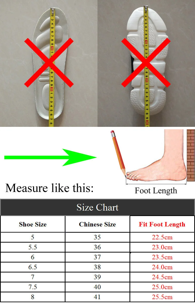 1. Китайский размер обуви отличается от вашей страны, в Китае, только Длина ступни позволяет выбрать правильный размер обуви. 2. Не точный замер длины вашей обуви в соответствии с размером, не Измерьте длину стельки. 3. Зная длину вашей стопы, выберите размер из нашей таблицы размеров, если ваша стопа широкая или толстая, чем обычно, то на один размер больше. 4. После того, как мы отправим вам обувь, пожалуйста, не забудьте отследить свою посылку и подобрать ее вовремя, или она будет разрушена, если с течением времени. 5. Если у вас есть какие-либо вопросы, пожалуйста, свяжитесь с нами, мы хотели бы вам помочь.