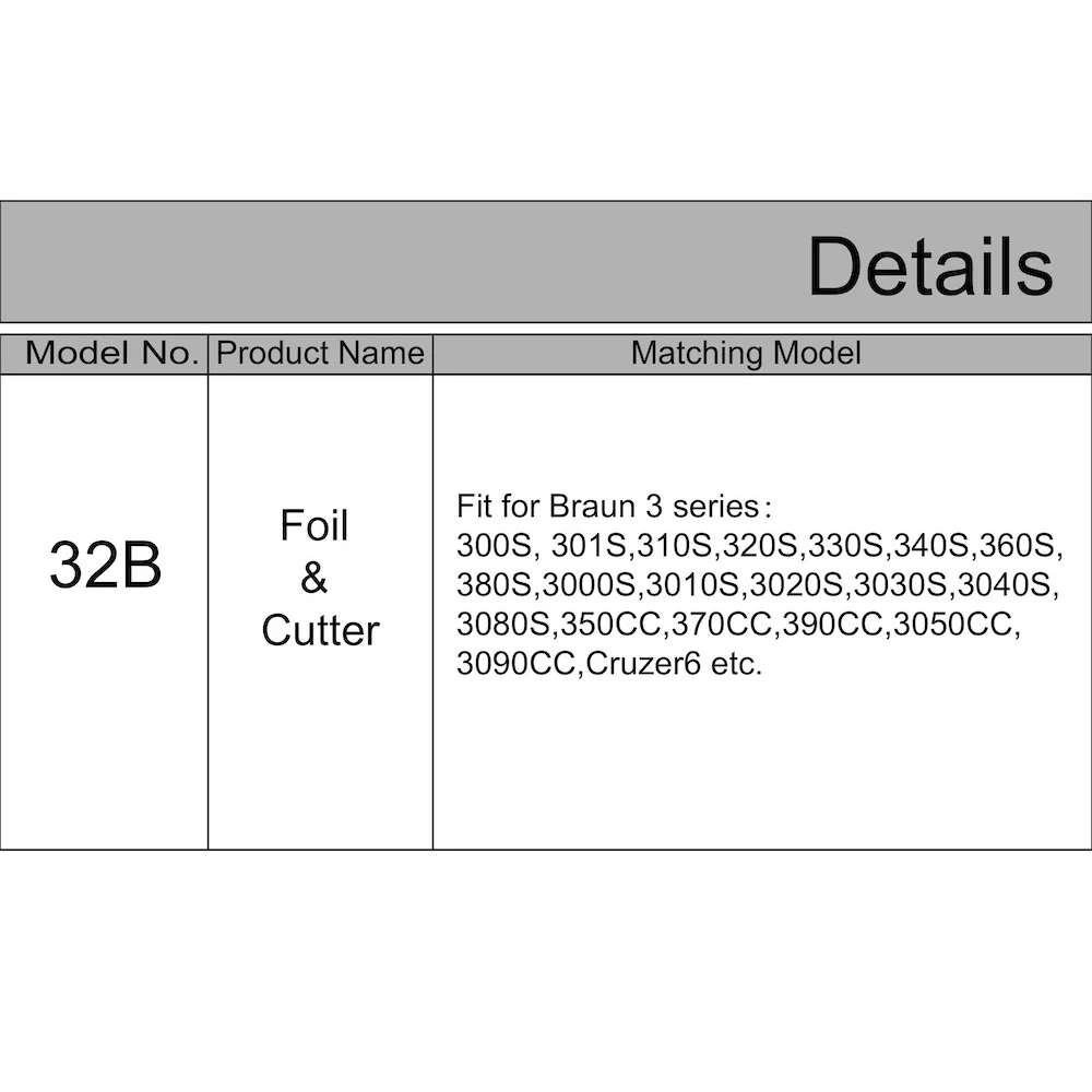 Для Braun Series 3: 301S, 310S, 320S, 330S, 340S, 360S, 380S, 3000S, 3020S, 3040S, 3080S, S, 350CC, 370CC, 390CC, 3050CC, 3090CC,Cruzer6 и т. Д. Пожалуйста, убедитесь в правильности вашей модели бритвы.