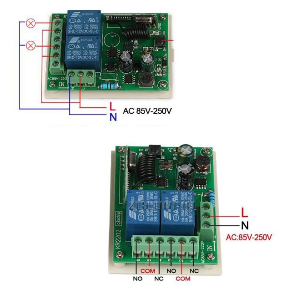 Входная мощность: 85 В-250 В переменного тока Ток в режиме ожидания:<5 мА Частота RF: 315 м или 433 м Режим работы RF: супергетеродинный Чувствительность приема: >97dbm Расстояние передачи: 20-50 м (открытое пространство) Режим декодирования: программное декодирование Удаленное Хранение: 25 шт. Поддержка удаленного типа: код обучения 1527, фиксированный код (скользящий код может быть дизайном) Режим работы: Мгновенный, тумблер, фиксация Тип проводки: фиксированная клемма Выходной терминал: нет, NC , COM Размер печатной платы: 68*47 мм. Схема проводки 1: НЕТ: выход, нормально открытый; COM: выход, общий; NC: выход, нормальное закрытие. Характеристики пульта дистанционного управления: Рабочая частота: 433,92 МГц Питание от 3 В батареи для монет (батарея входит в комплект), Материал: ПВХ. Кнопка: 2 кнопки Размер: 59 мм x 28 мм x 8 мм; Рабочее напряжение: 3 В; Рабочий ток: 12 мА Мощность передачи: 10 мВт Режим модуляции: ASK (AM). Тип кодирования: обучение. Расстояние передачи: 80 м.