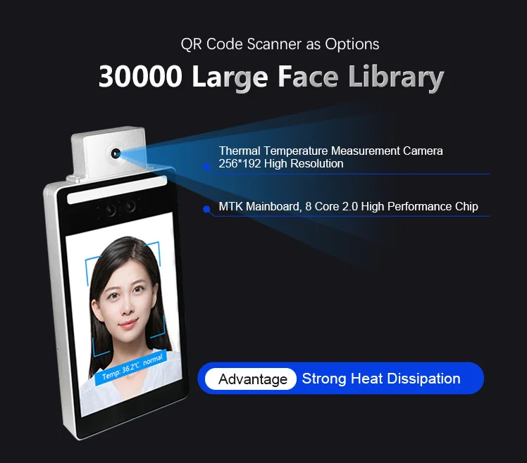 Традиционный инфракрасный измеритель температуры требует, чтобы человек работал на близком расстоянии. Использование устройства контроля доступа для измерения температуры лица позволяет экономить рабочую силу, сокращать контакт и избегать перекрестной инфекции. Он может заменить посещаемость отпечатков пальцев и уменьшить инфекцию отпечатков пальцев. Когда сотрудники завершат измерение температуры, записи будут загружены;