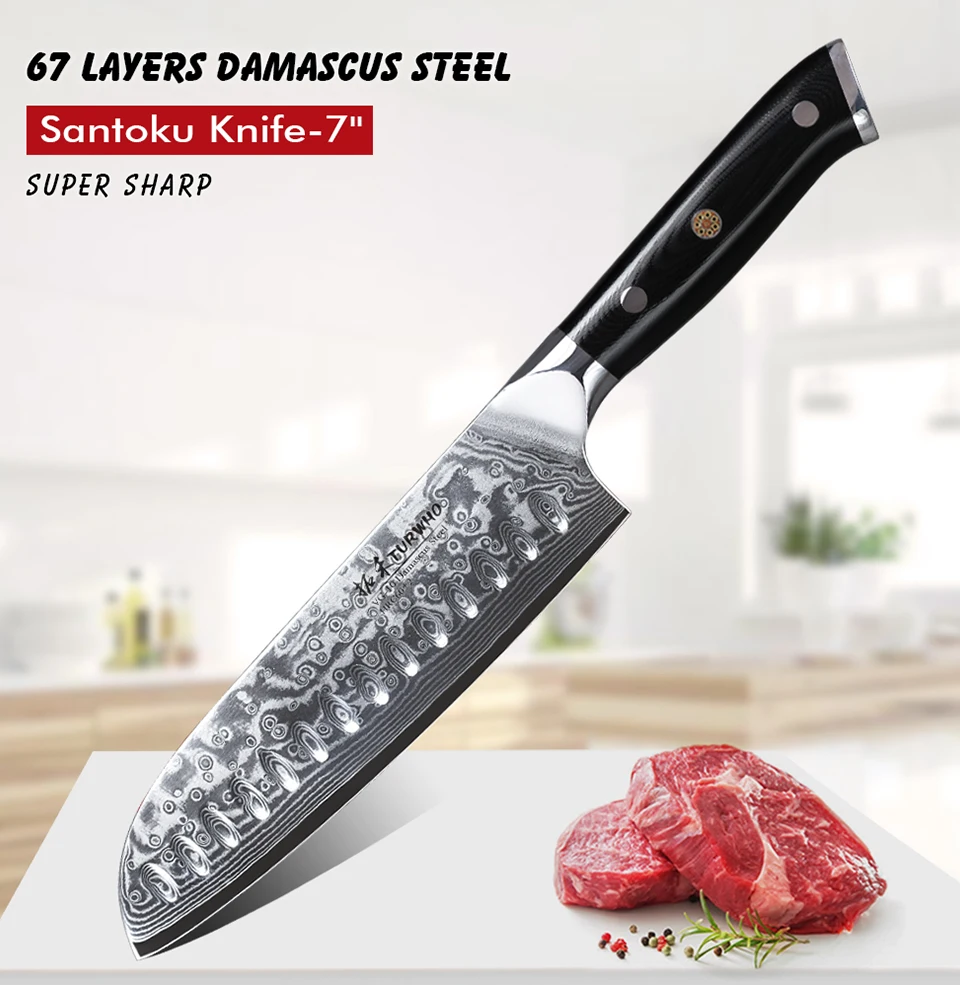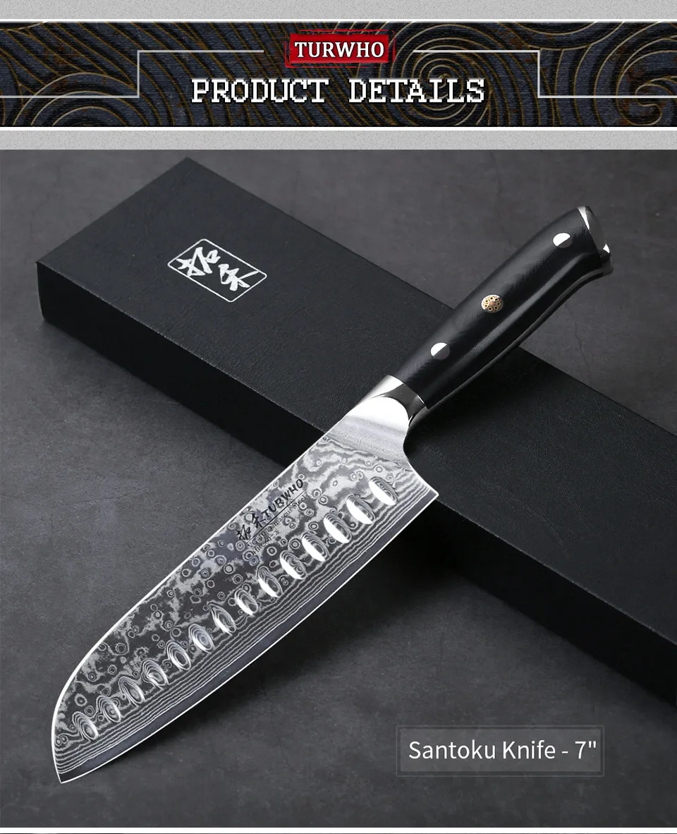 Технические характеристики: * 7-дюймовый Santoku Ножи * Вес (только товар): прибл. 250 г * Материалы: VG-10 Дамасская сталь * Тройная заклепочная Ручка G10 * Пожизненная Гарантия О нож TURWHO/ SANTOKU Этот нож Santoku с отличительным закругленным наконечником и плоским лезвием делает его отличным при измельчении почти всего, что вы положите перед ним. Как и классический нож шеф-повара, нож Santoku немного короче и легче, что делает его любимым среди людей, которые являются новыми для приготовления пищи или предпочитают использовать измельчитель или нарезанный ломтик. Этот нож имеет тонкое лезвие и плоское дно, что делает его идеальным для резки овощей, рыбы и мяса.