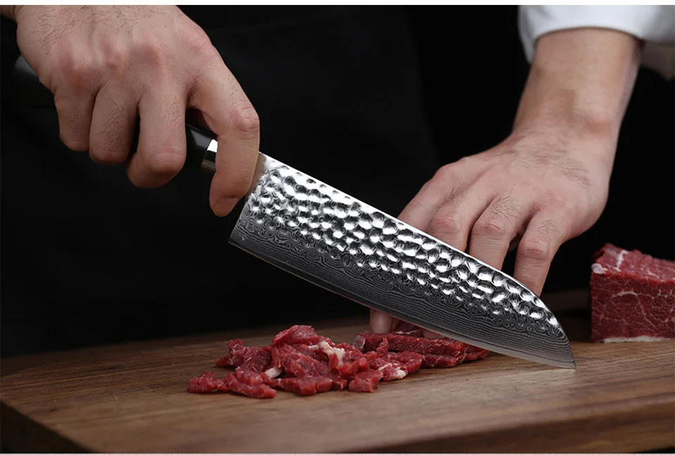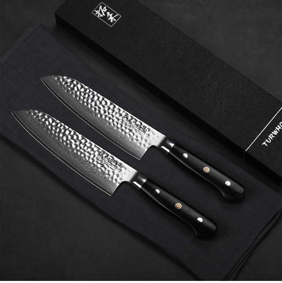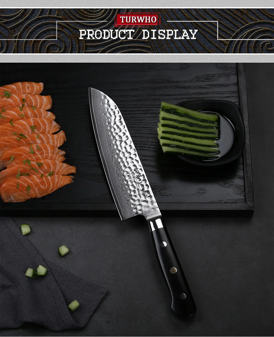Характеристики: * 7-дюймовый нож Santoku * Вес (только товар): прибл. 213 г * Материалы: VG-10 Дамасская сталь * Тройная заклепочная эбеновая ручка * Пожизненная Гарантия О нож TURWHO/ SANTOKU Универсальный нож с закругленным кончиком и плоским лезвием делает его отличным при измельчении практически всего, что вы положите перед ним. Как и классический нож шеф-повара, нож Santoku немного короче и легче, что делает его любимым среди людей, которые являются новыми для приготовления пищи или предпочитают использовать измельчитель или нарезанный ломтик. Этот нож имеет тонкое лезвие и плоское дно, что делает его идеальным для резки овощей, рыбы и мяса.