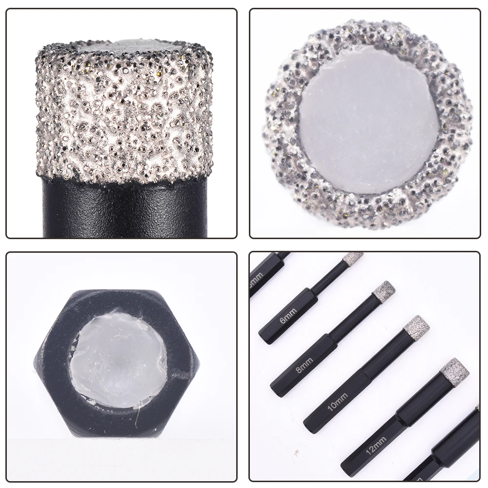 Сверло с сухим алмазом использует технологию вакуумной пайки, которая позволяет использовать сухое сверло при более высокой температуре для резки твердой фарфоровой плитки, керамики, мрамора и сланца с легкостью. Интегрированный lubrivant помогает охлаждать и продлевает срок службы, что означает, что нет необходимости в дополнительной смазке.